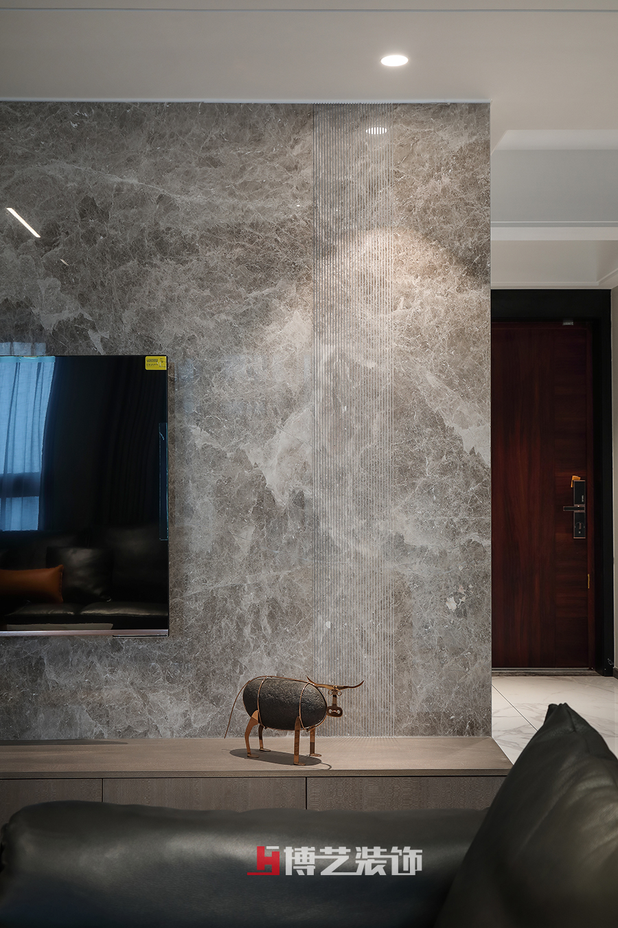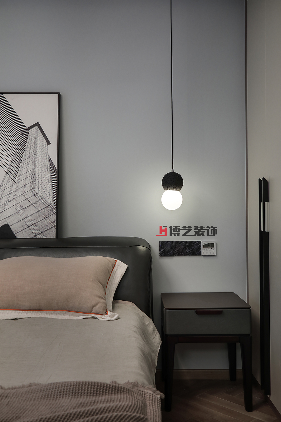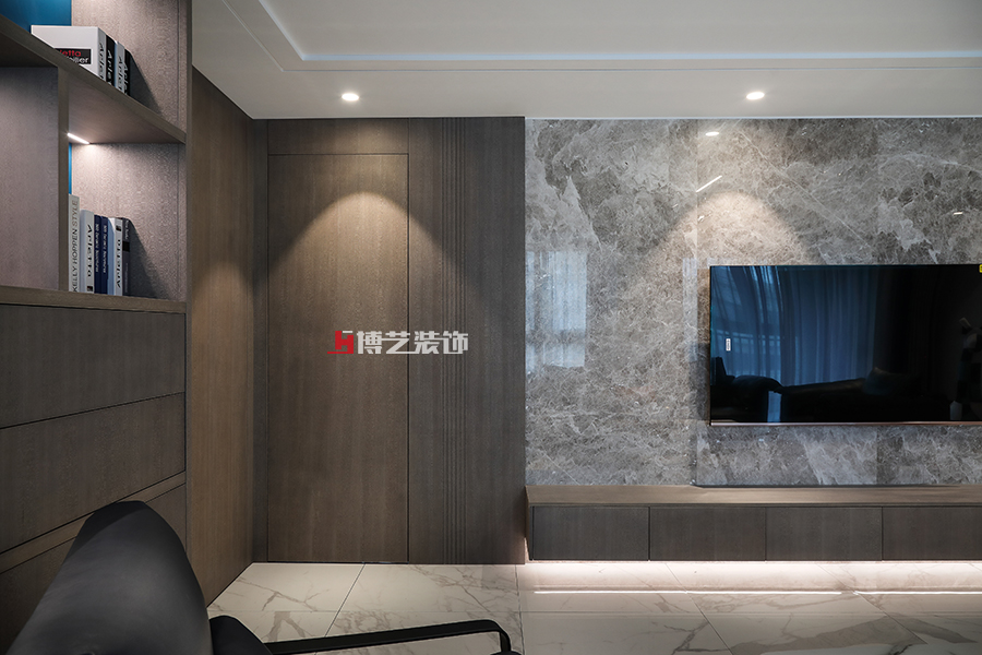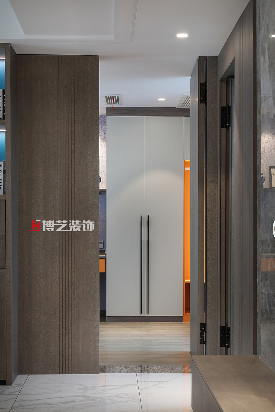 設(shè)計(jì)理念: 本案的亮點(diǎn)之處在于隱形門的設(shè)計(jì)。設(shè)計(jì)師打破常規(guī)門高的設(shè)計(jì),呈現(xiàn)出了一套隱形通頂門的效果,使得整體看上去大氣而整體。吊頂上面沒有過多的設(shè)計(jì)層次,呈現(xiàn)的是一種簡(jiǎn)約而不簡(jiǎn)單的設(shè)計(jì),保持所有事物該有的本真效果。整體采用大量的木飾面與同色系柜體相結(jié)合的形式,給人一種視覺上相融合的感覺。而電視背景的設(shè)計(jì)上,設(shè)計(jì)師采用了線條抽縫的設(shè)計(jì)效果增加了整體空間的層次感。也體現(xiàn)了設(shè)計(jì)師對(duì)于現(xiàn)代風(fēng)格的獨(dú)到見解。
