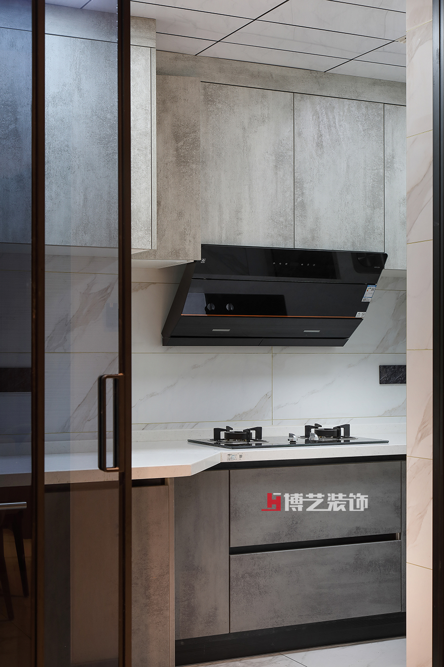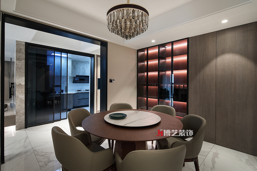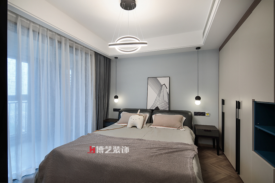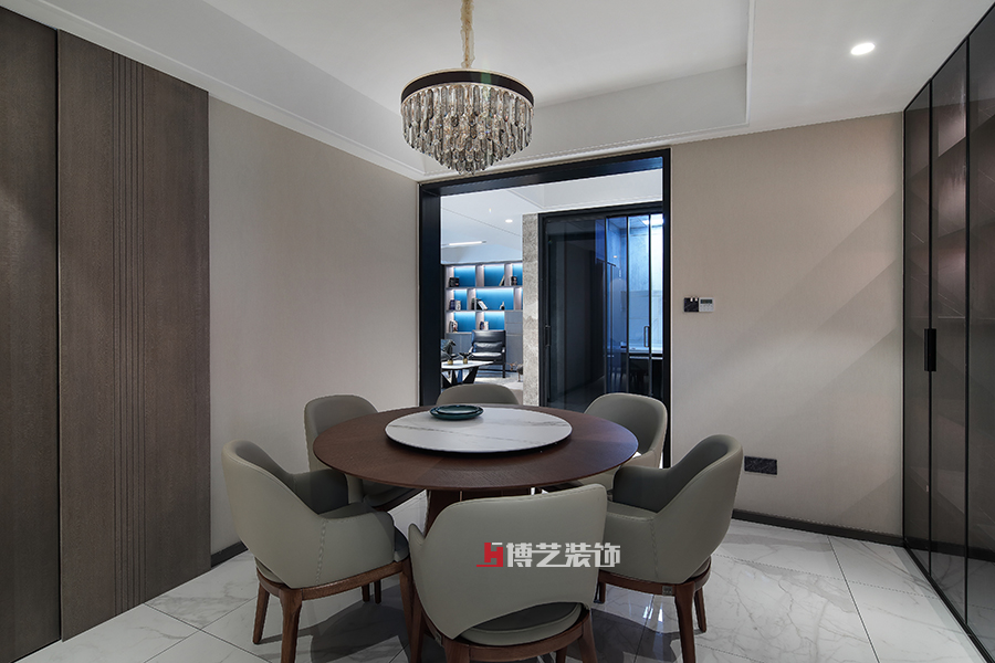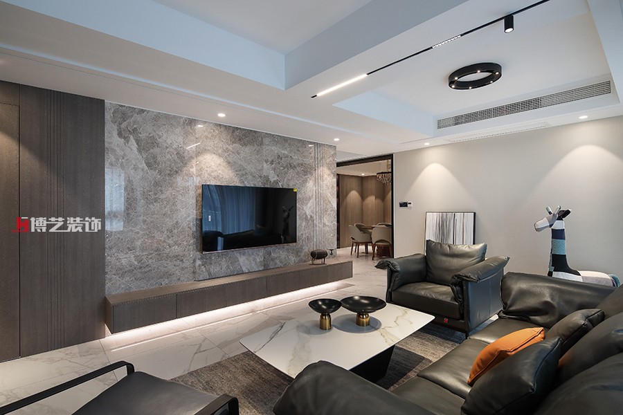 設(shè)計(jì)理念: 本案的亮點(diǎn)之處在于隱形門的設(shè)計(jì)。設(shè)計(jì)師打破常規(guī)門高的設(shè)計(jì),呈現(xiàn)出了一套隱形通頂門的效果,使得整體看上去大氣而整體。吊頂上面沒有過多的設(shè)計(jì)層次,呈現(xiàn)的是一種簡(jiǎn)約而不簡(jiǎn)單的設(shè)計(jì),保持所有事物該有的本真效果。整體采用大量的木飾面與同色系柜體相結(jié)合的形式,給人一種視覺上相融合的感覺。而電視背景的設(shè)計(jì)上,設(shè)計(jì)師采用了線條抽縫的設(shè)計(jì)效果增加了整體空間的層次感。也體現(xiàn)了設(shè)計(jì)師對(duì)于現(xiàn)代風(fēng)格的獨(dú)到見解。