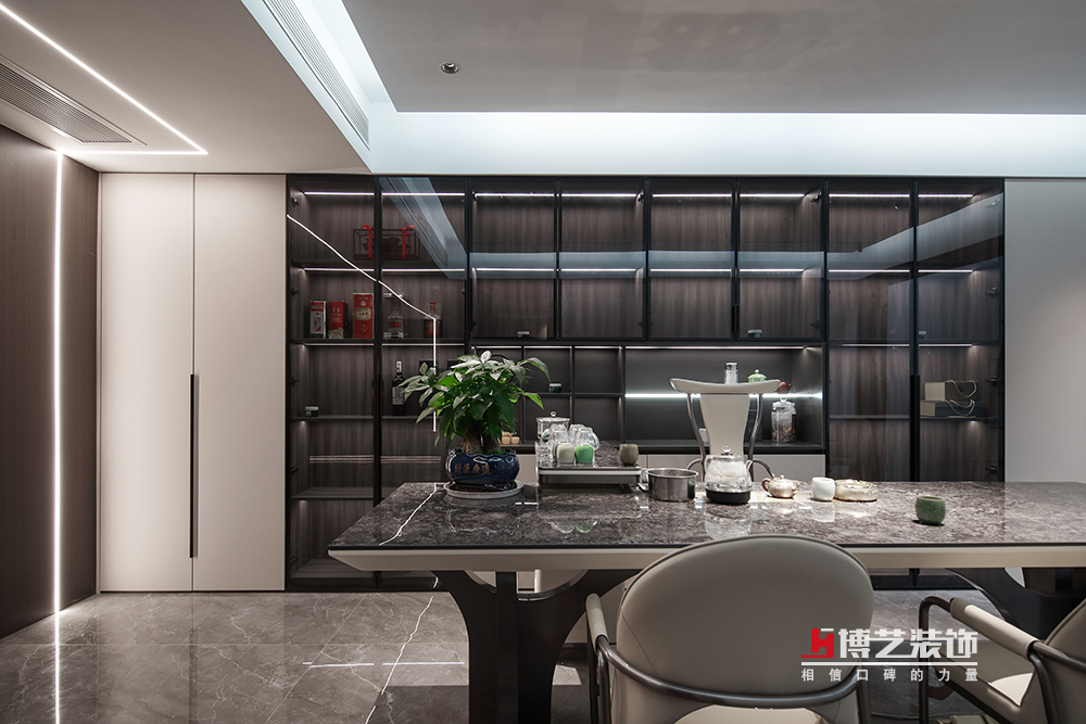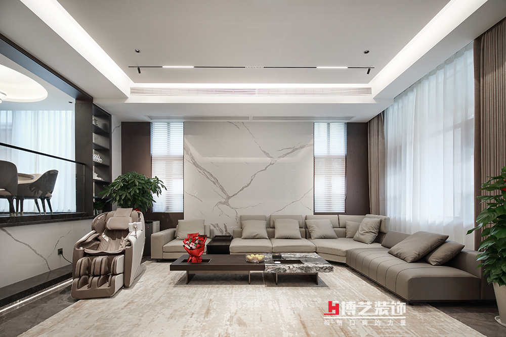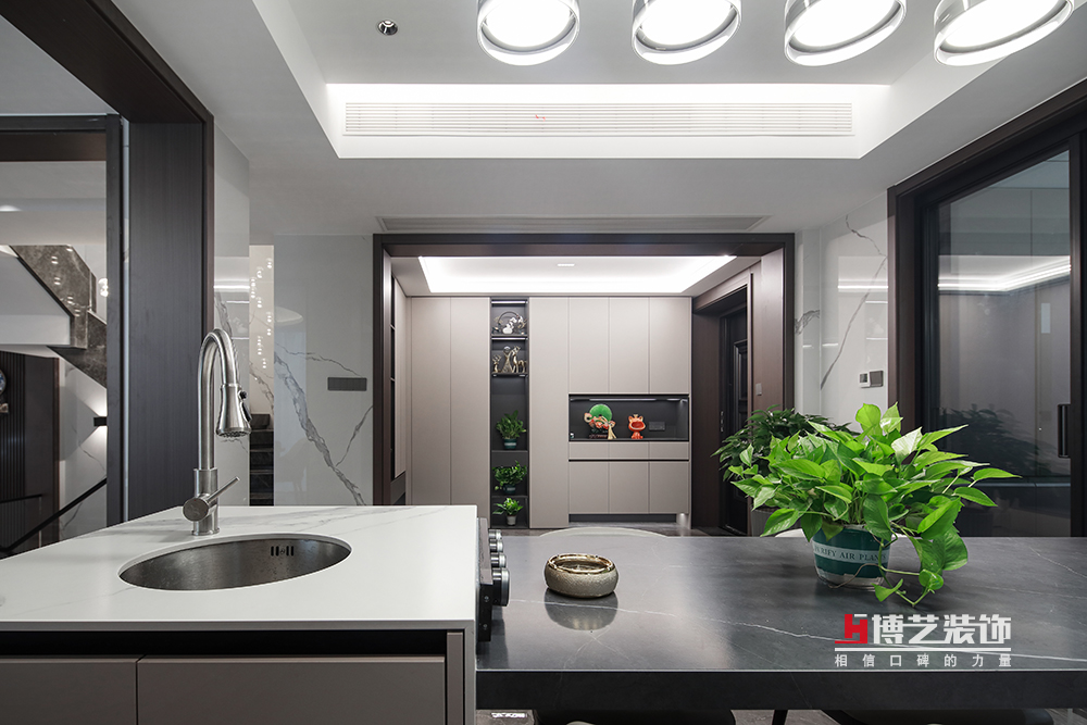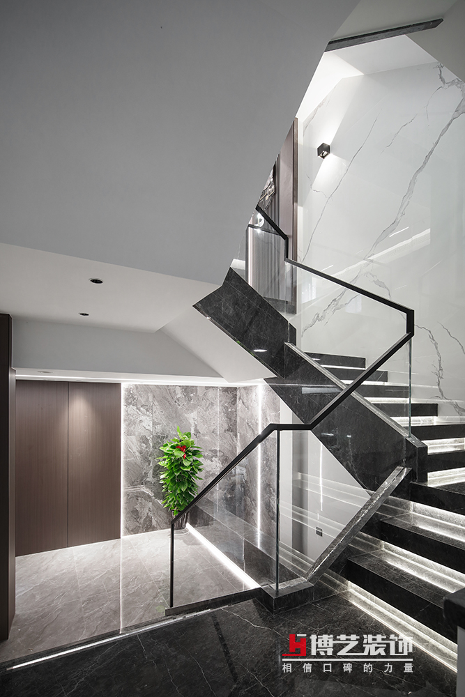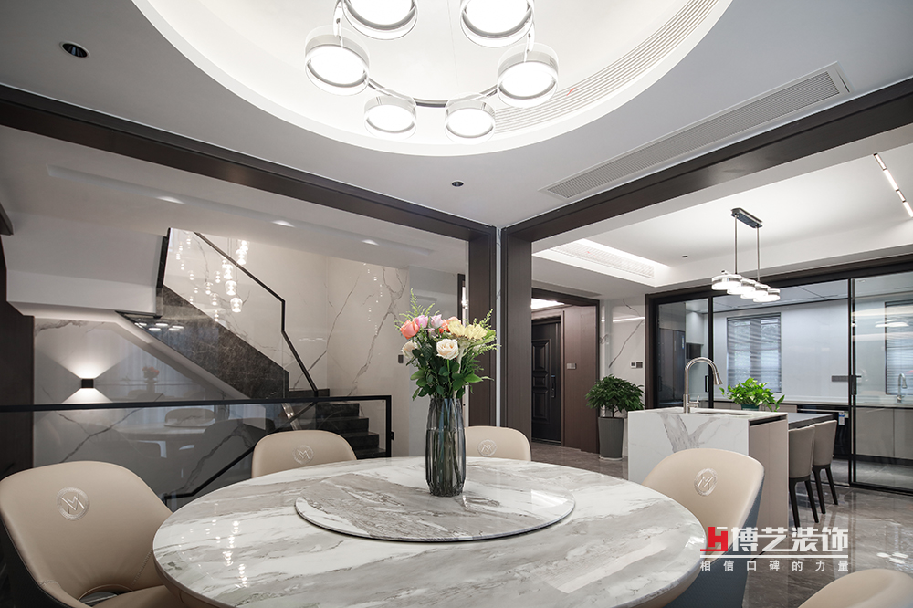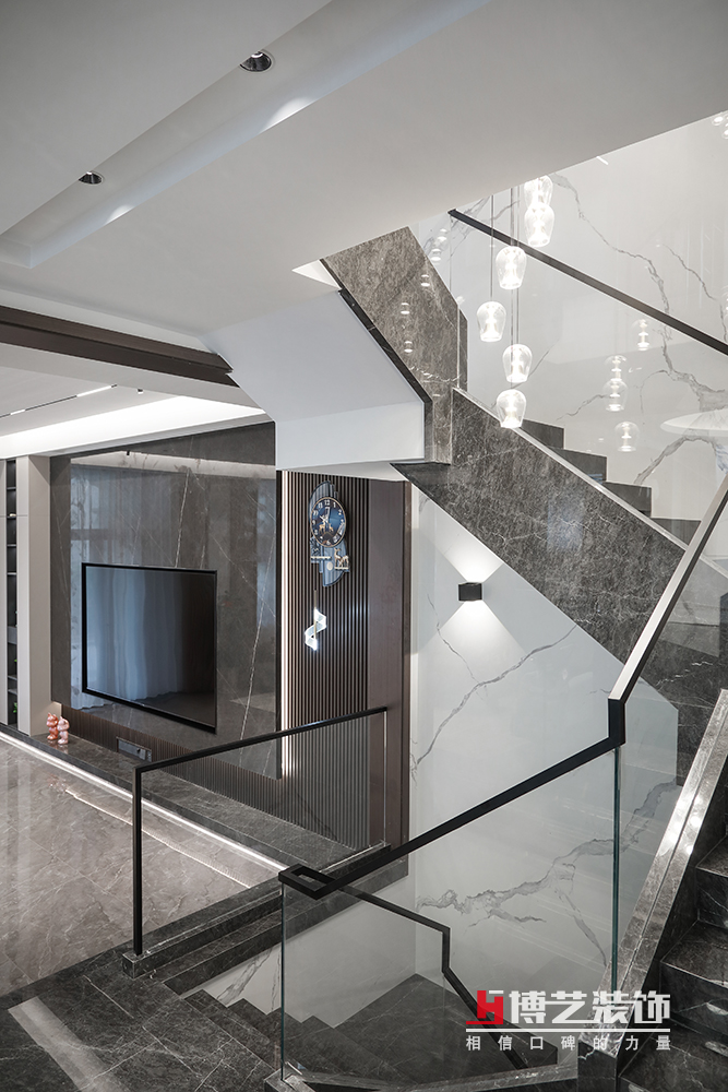 設(shè)計(jì)師以經(jīng)典的黑白灰色調(diào)入手,調(diào)和著現(xiàn)代住宅對于低調(diào)質(zhì)感生活的追求。通過合理運(yùn)用玻璃,石材,格柵,不銹鋼,布藝,皮質(zhì)等不同材質(zhì),融合進(jìn)整個(gè)一樓公區(qū)。無主燈的設(shè)計(jì)搭配下沉式空間,讓整個(gè)客廳區(qū)域彰顯氣質(zhì)。電視機(jī)的黑色大理石背景和沙發(fā)的白色大理石背景遙相呼應(yīng),在黑白之間,打造無限延伸的空間感。