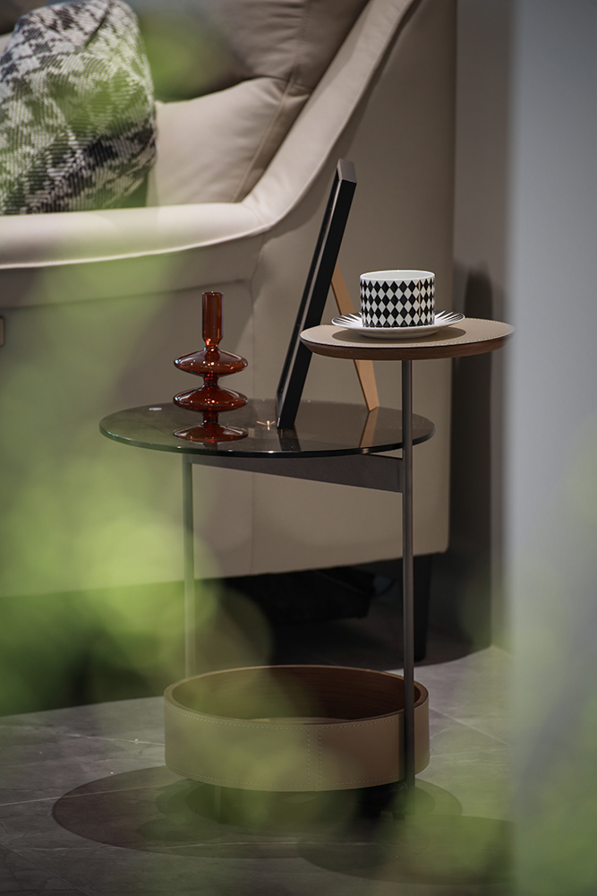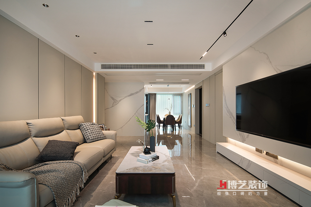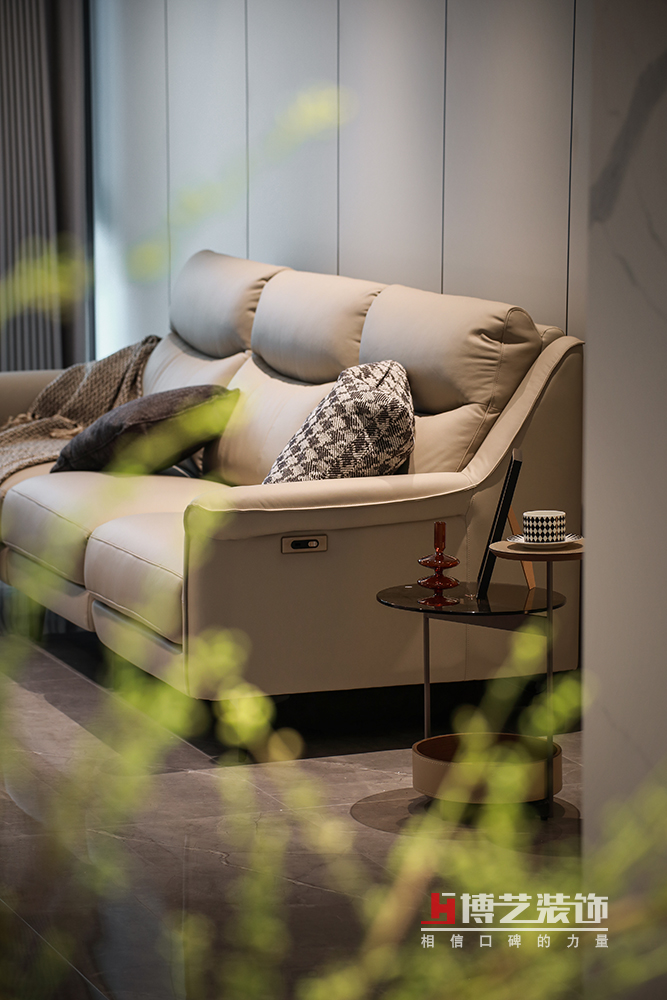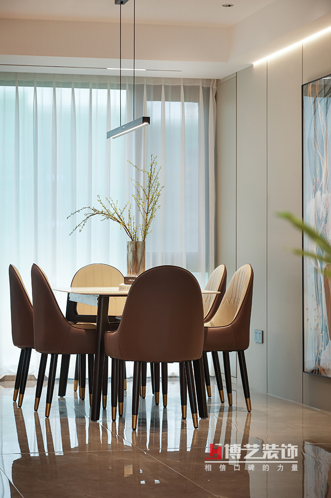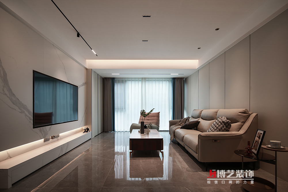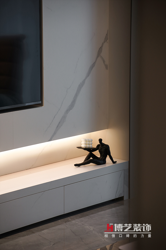 整個客廳空間以米灰色為主色調,巖板的電視背景,木作的沙發(fā)背景,通鋪的大理石磚,都以獨特的啞光質感,述說空間的溫潤氣質,烘托家庭生活浪漫溫馨的場景。