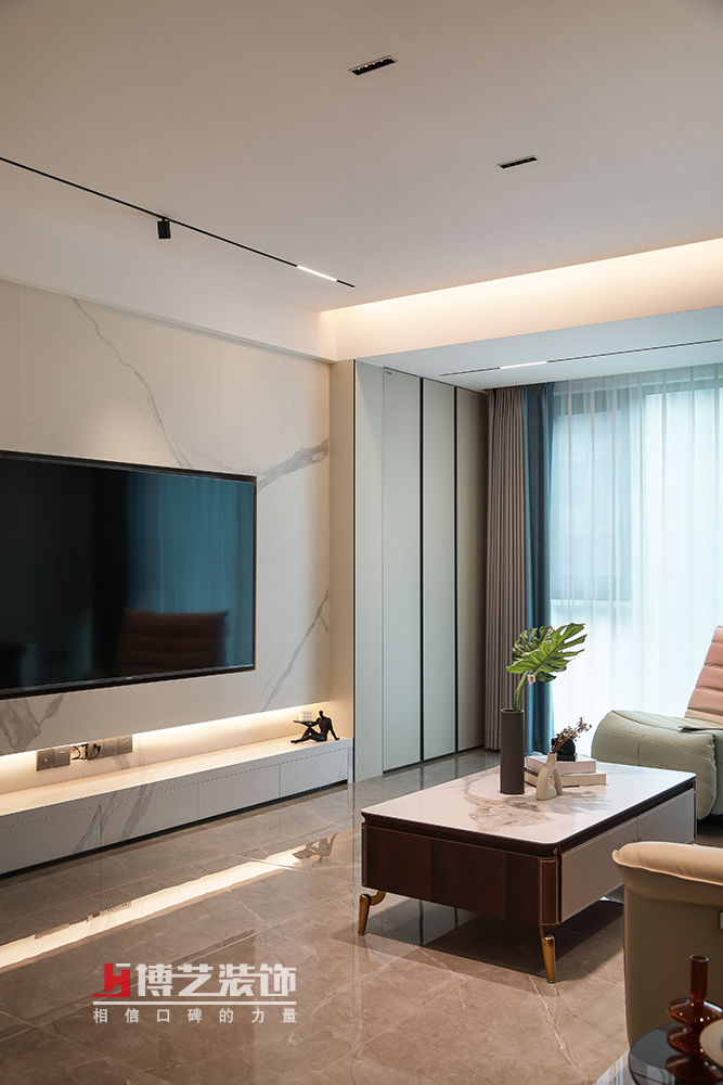 把陽臺并入客廳空間,采用無主燈設計,拉升了整個空間感,用軌道燈,筒燈,線性燈營造一步一景的美好家居生活。整個墻面設計,與柜門同色,讓房門柜子都做到隱形,增添大氣。
