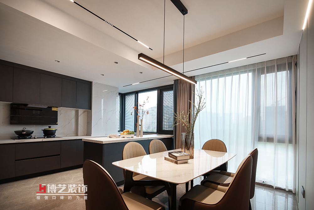 極佳的采光和溫馨的就餐環(huán)境,讓這片區(qū)域變成了一個互動空間。孩子在這里做作業(yè),妻子在廚房準備晚餐,丈夫在島臺洗切準備,一切都是歲月靜好的模樣。
