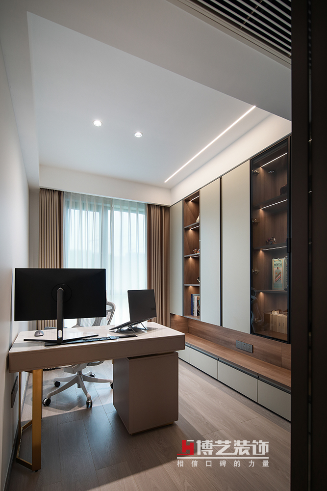 書房用一道移門隔斷,更好地融入到主臥套間,將功能和空間做到最好的融合。既是工作時的自由天地,也是休閑時的放松之所。書柜用不同顏色門板,開放格和玻璃等進行展示,配合燈光,既保證了功能上的實用,也打破了整排書柜的沉悶。