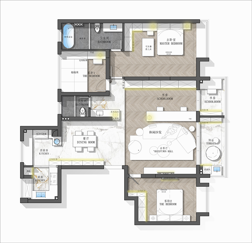 書(shū)房與客廳相連,通過(guò)地面的不同鋪貼做功能上的劃分,敞開(kāi)式的設(shè)計(jì)空間上不設(shè)限,思緒可以發(fā)散性的擴(kuò)散,工作學(xué)習(xí)不再壓抑,輕松的環(huán)境也是事半功倍的重要因素。