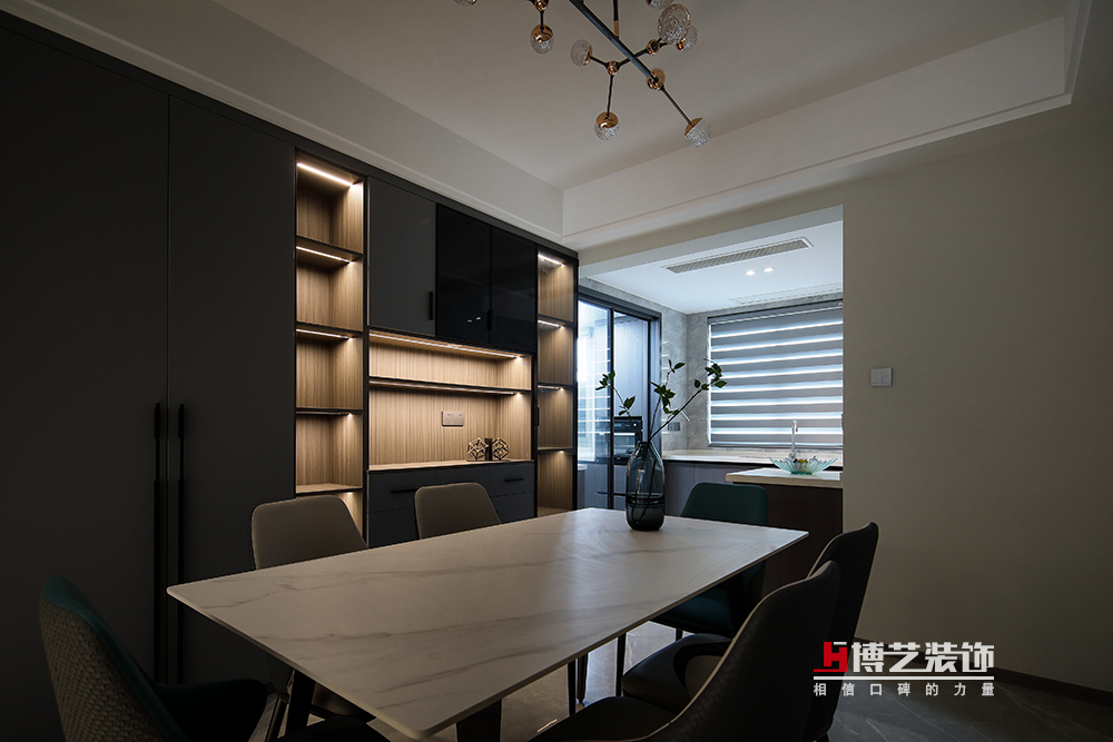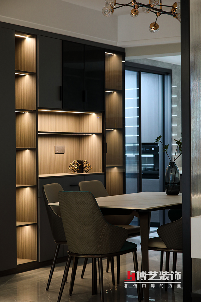 餐邊柜與書(shū)柜形成斜角對(duì)稱(chēng),適宜的尺度感調(diào)動(dòng)了空間的靈活性,島臺(tái)作為廚房功能的延續(xù),增添了更多的可操作性,家庭成員間的互動(dòng)更加頻繁,彼此的親密度更高。
