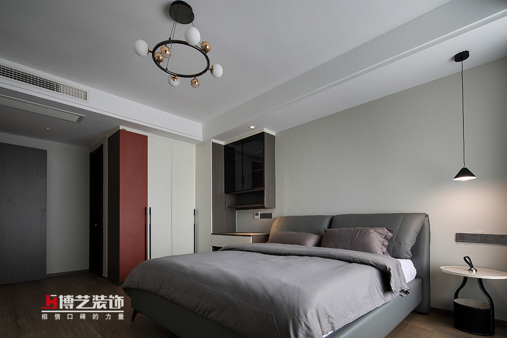 臥室以淺色為主,營(yíng)造松弛平靜的氛圍感,轉(zhuǎn)角一抹紅色,不張揚(yáng)卻揮灑著精致優(yōu)雅。
