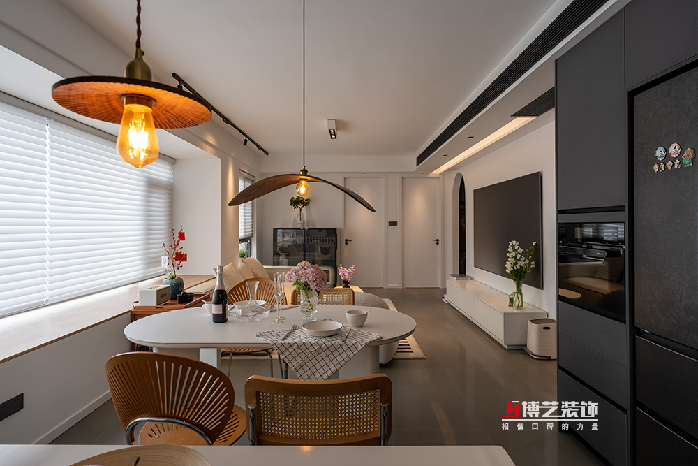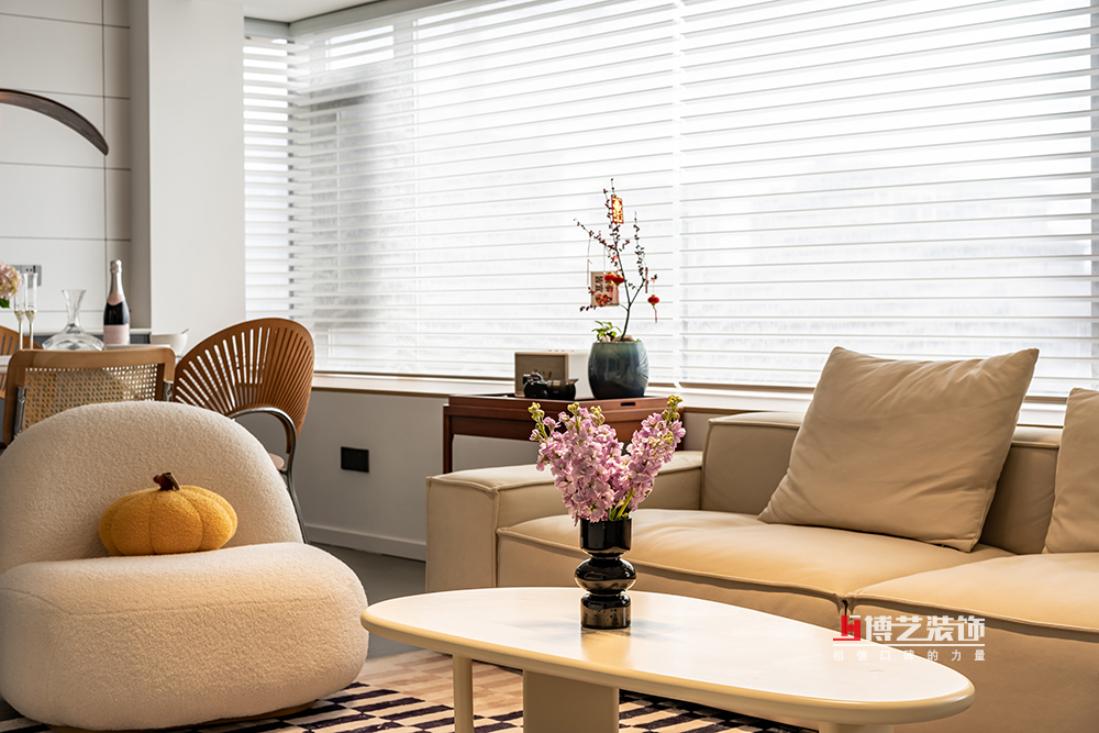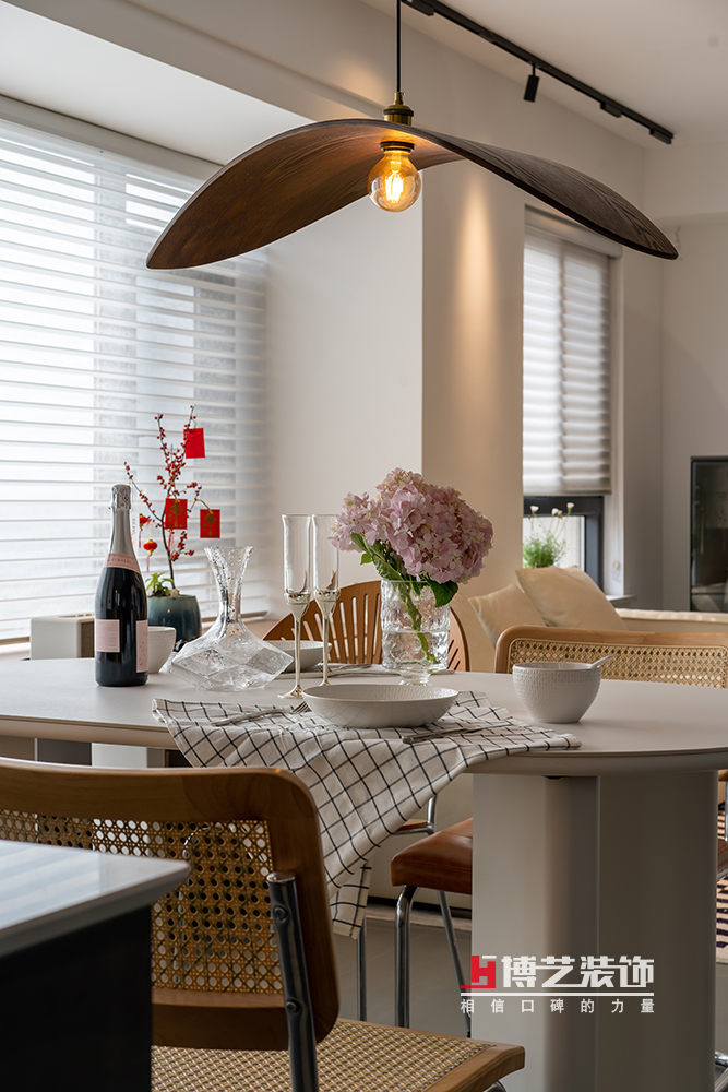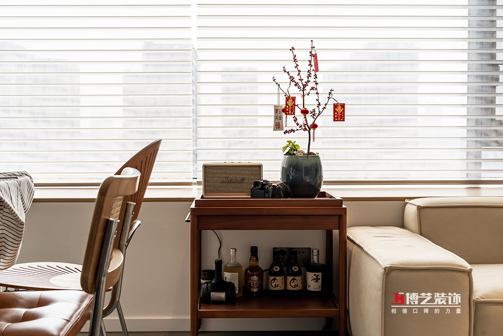用一個小小的邊幾作為客廳和餐廳之間的過度,放上好酒好茶,共品音樂詩畫。落地飄窗搭配百葉簾,讓整個客廳蒙上了陽光的濾鏡。
