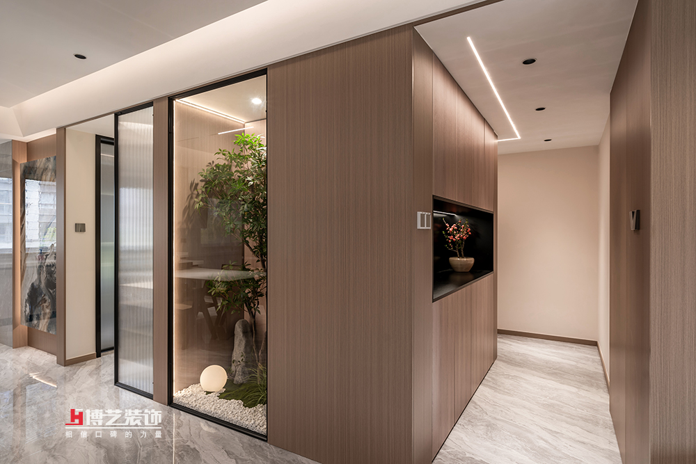 房屋的中心線上做玄關(guān)造型,開門第一眼的“風景”。圍繞玄關(guān)將裝飾柜,洗衣區(qū),衛(wèi)生間干區(qū)集合形成第一條洄游動線,利用空間再做一個儲物間,滿足收納和生活所需。
