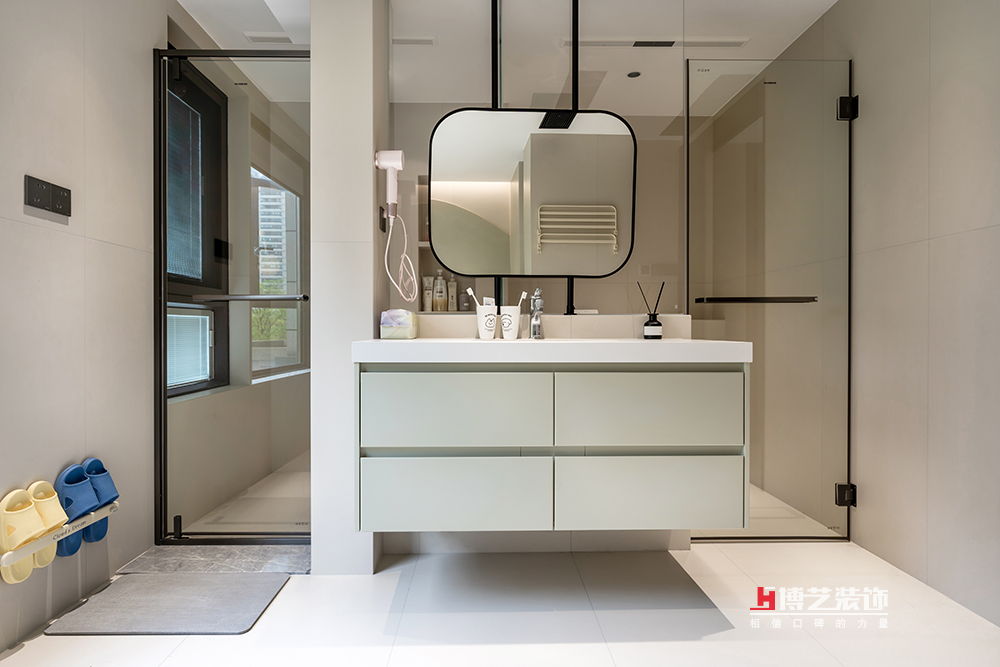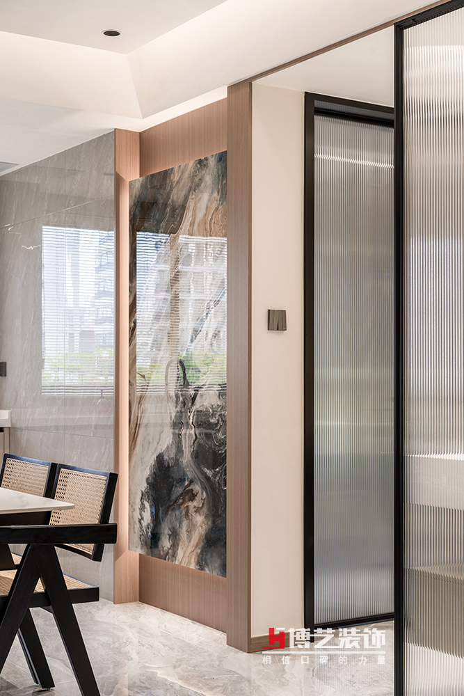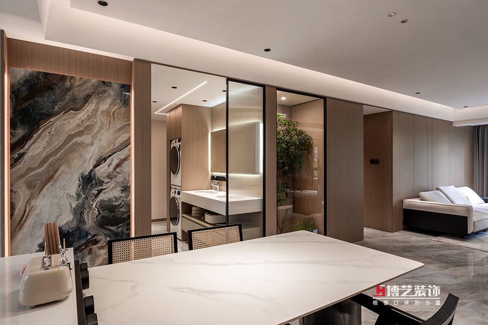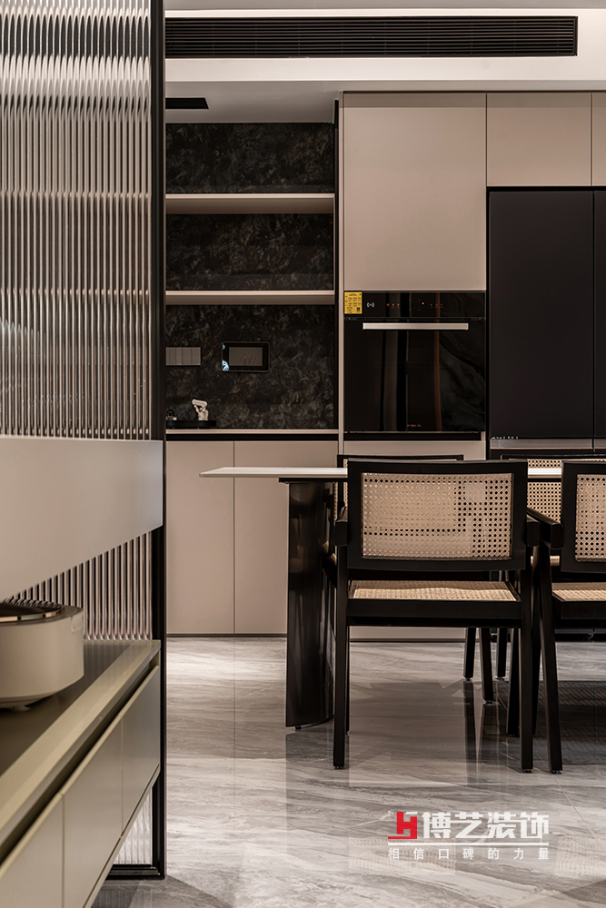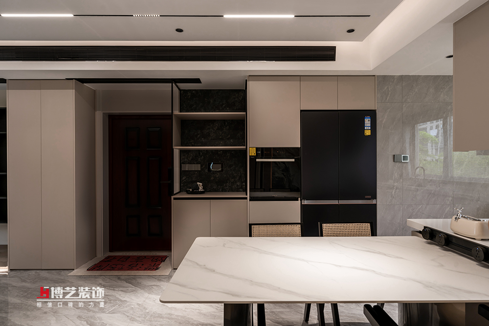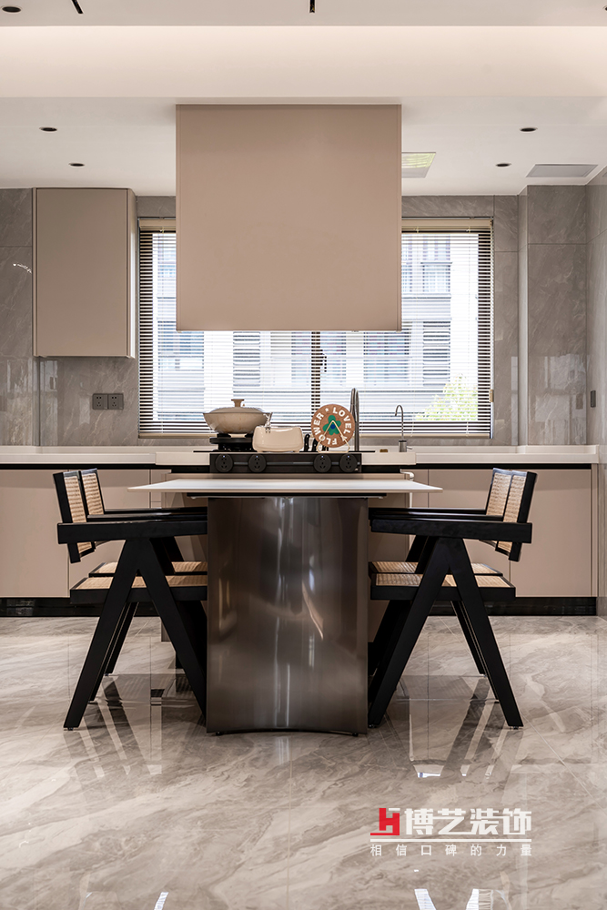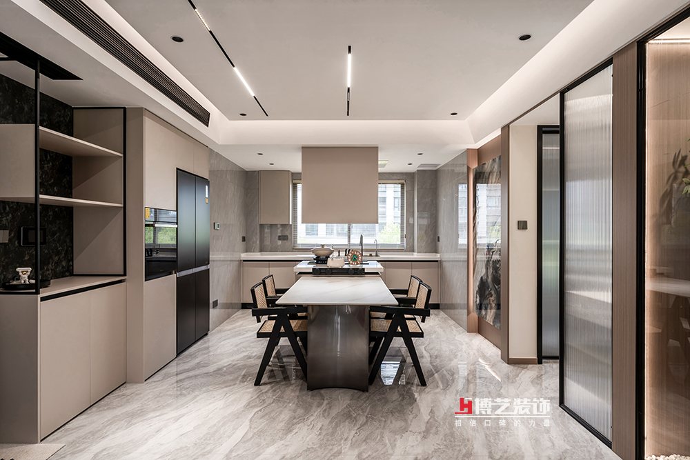設(shè)備平臺打通做餐廚區(qū),將空間縱向延伸,北邊較好的自然光也讓整個餐廚空間明亮開闊。把煙機灶具安放在導臺位置,洗切炒放,一氣呵成。餐邊柜與西廚結(jié)合,開放式的設(shè)計形成全屋的第二條洄游動線。
