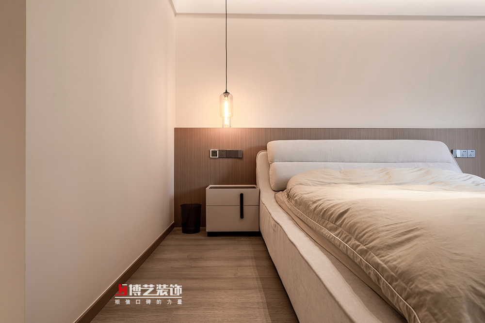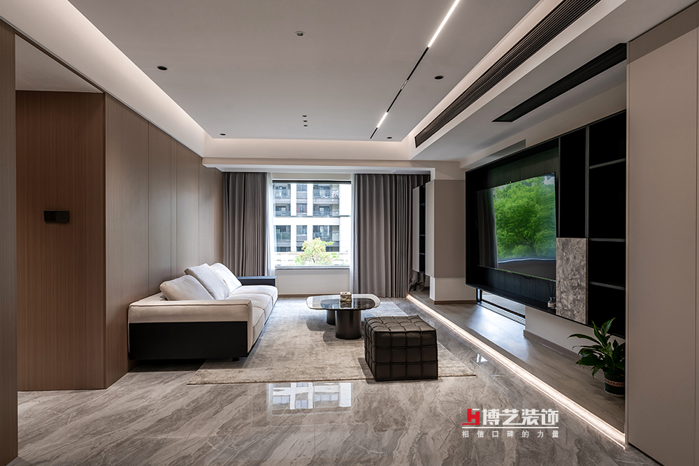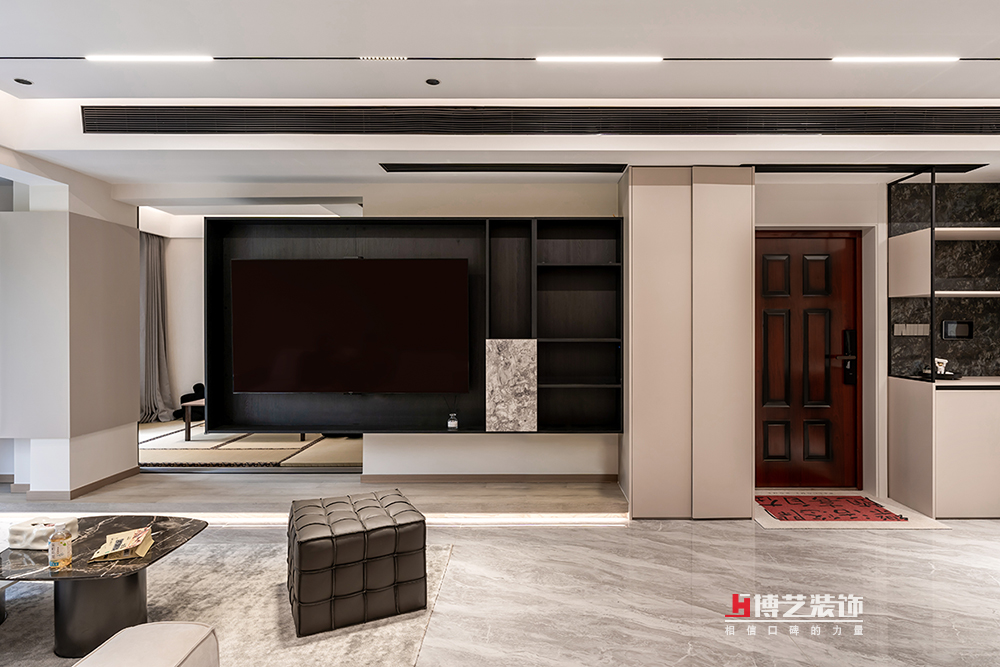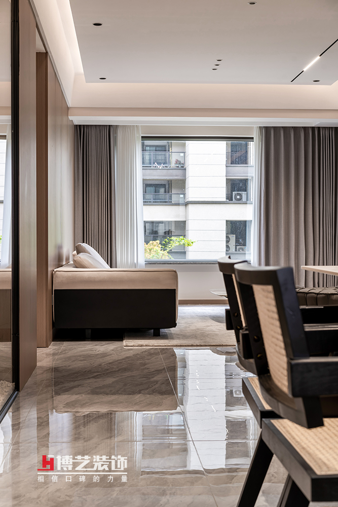 把陽臺打通納入客廳使客廳重心向南偏移,利用墻體打造的背景墻,弱化了結(jié)構(gòu)本身帶來的缺陷,懸浮背景墻的設(shè)計在視覺上更具穿透性,延伸從而使空間更寬敞。