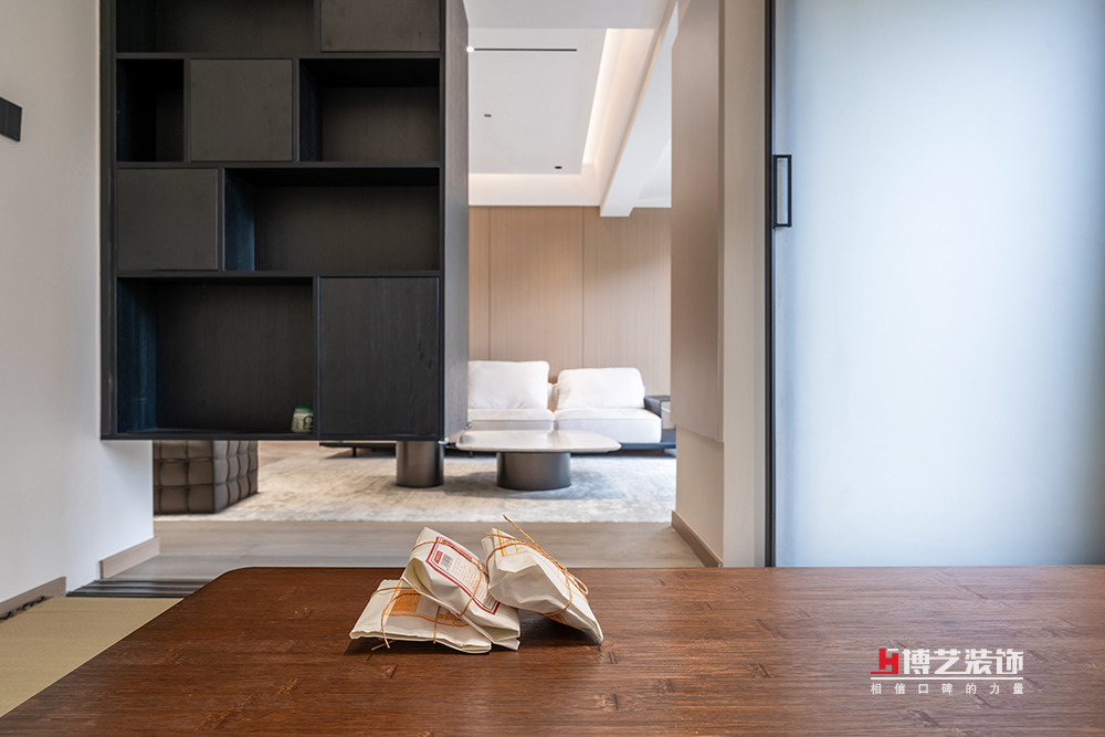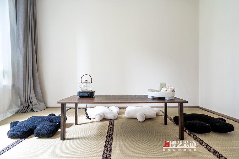 因為喜歡與好友相聚,所以設(shè)計了一間茶室。以榻榻米的形式呈現(xiàn),與客廳互通,可封閉可開放,未來也可成為孩子的游戲場所及親子區(qū)。