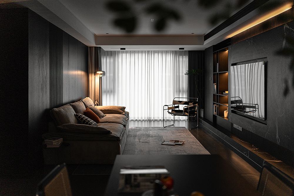 黑色煙熏木的質(zhì)感帶來了自然的溫暖和親近感,與黑色巖板的堅(jiān)實(shí)和穩(wěn)定形成了完美的對(duì)比。一個(gè)紅色沙發(fā)瞬間賦予了整個(gè)空間一抹鮮亮的活力,一株綠植瞬間打破了暗黑空間的沉寂。