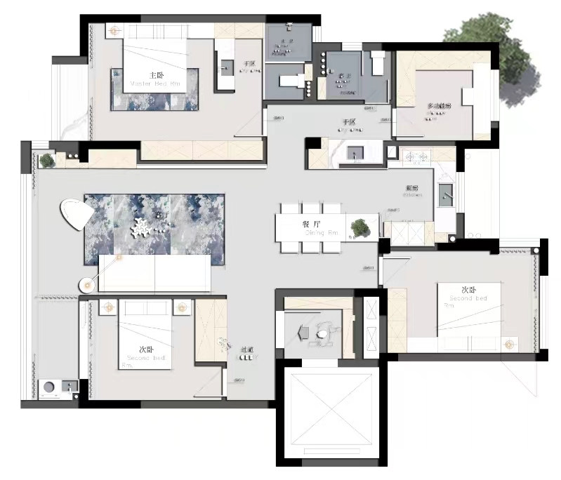 1、進(jìn)門打造入戶玄關(guān),利用次臥墻體做工字墻,同時(shí)做衣柜及玄關(guān)柜,滿足收納與整理需求,次臥保留生活陽臺(tái)可洗衣可晾曬等;