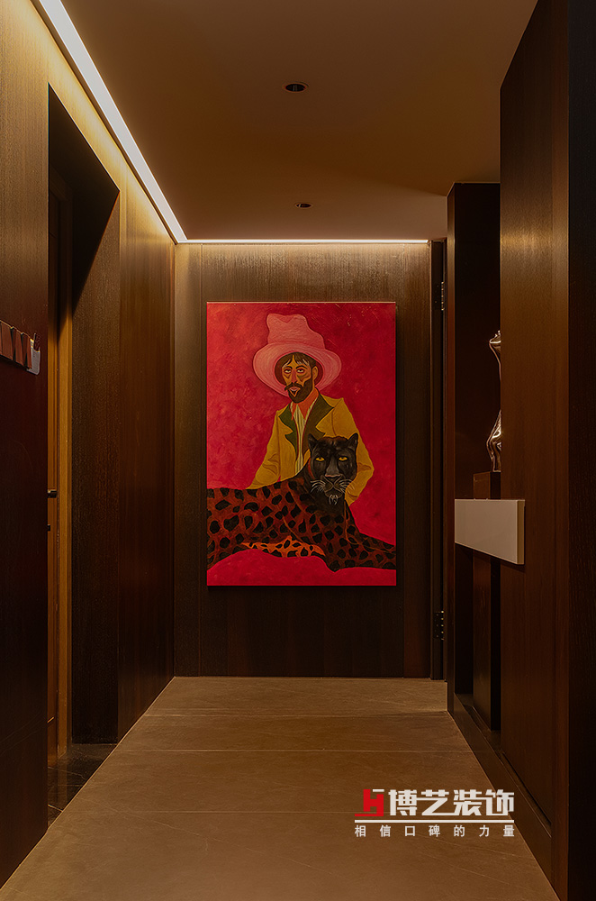 進(jìn)門的一瞬間,就被玄關(guān)的大紅色掛畫所吸引,粉色西部牛仔搭配棕黑色豹子,墊定了主人一家獨(dú)立自主的性格和對(duì)自由的深沉熱愛,我們不禁要一探究竟這個(gè)充滿個(gè)性又自由浪漫的家。
