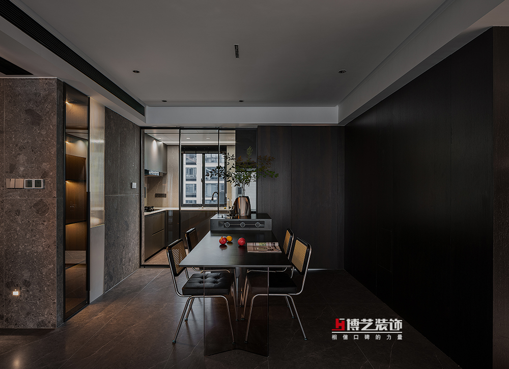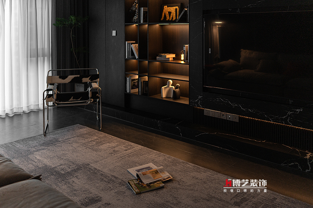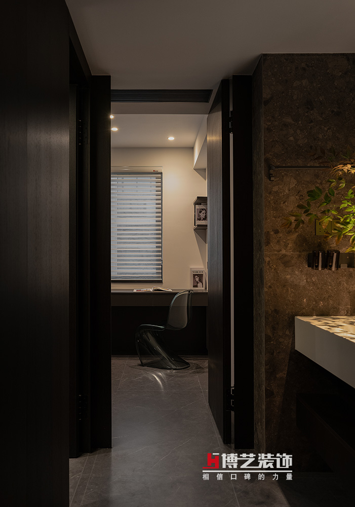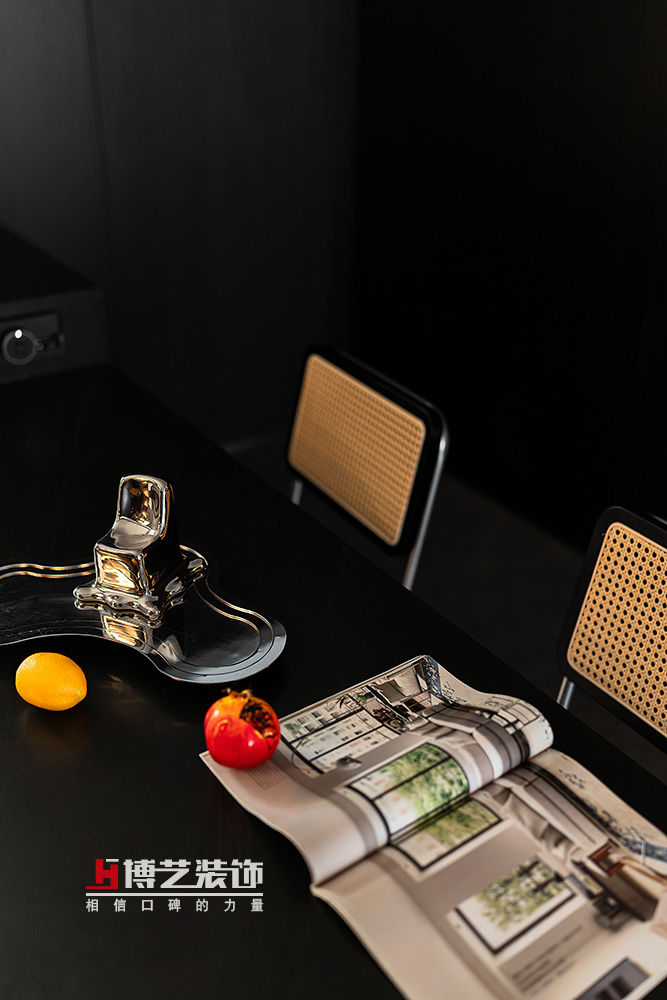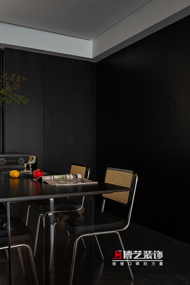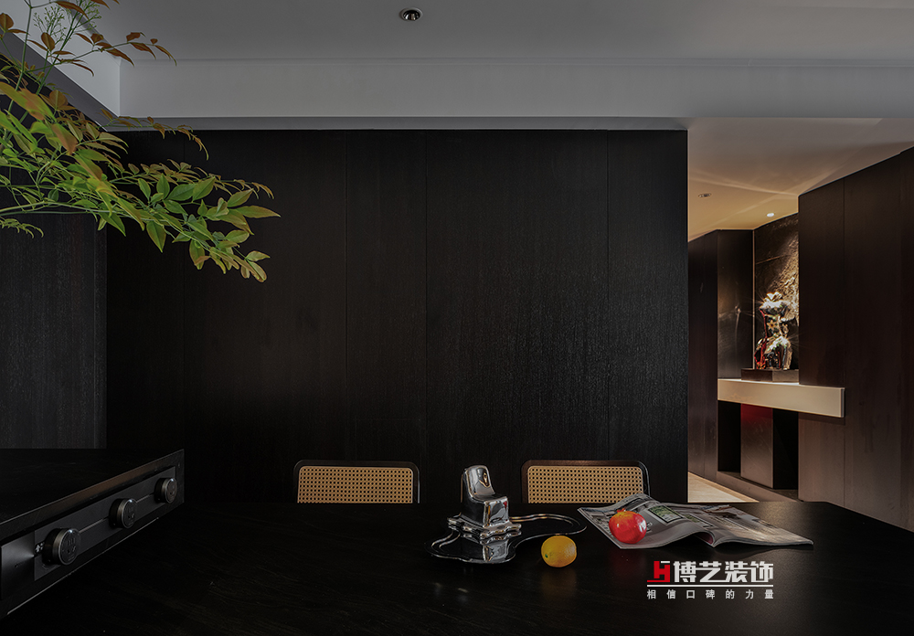 一枝蓬勃的綠色,打破黑色帶來的沉悶給空間帶來生機(jī),不同的質(zhì)感不同的色彩共同營造出空間的活力。