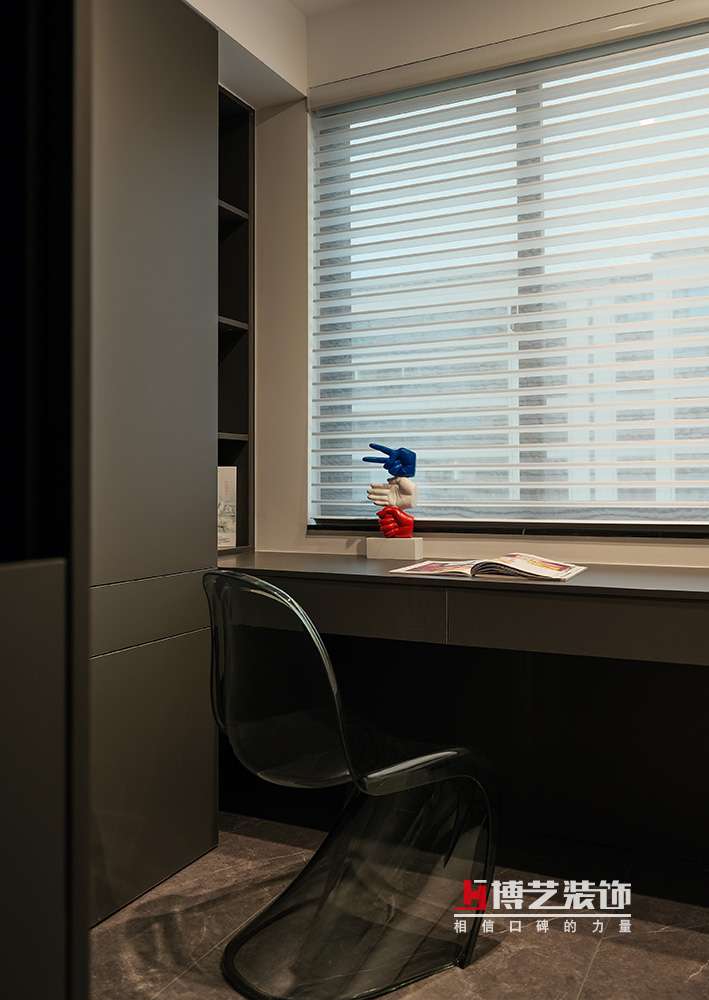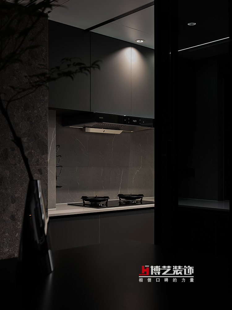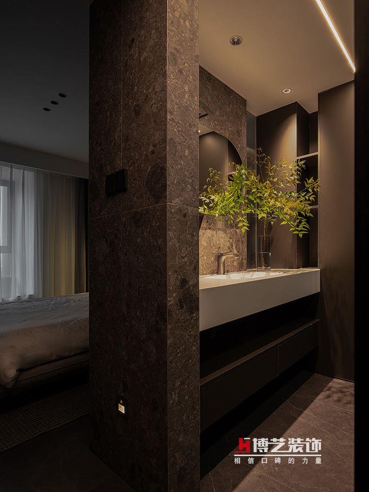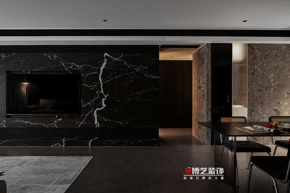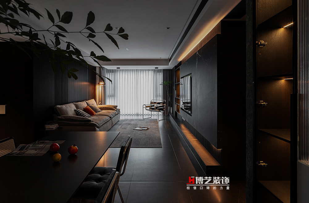 一枝蓬勃的綠色,打破黑色帶來的沉悶給空間帶來生機(jī),不同的質(zhì)感不同的色彩共同營造出空間的活力。