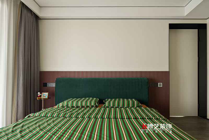 主臥延續(xù)客餐廳的紅,以波浪的形狀展現(xiàn),木材所特有的屬性平添了幾分沉穩(wěn)與質(zhì)感,搭配的墨綠色床靠,綠色的床品,奶白色柜體,營(yíng)造出空間的層次感,為居所帶來(lái)清新自然的休息環(huán)境。