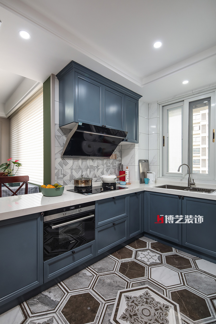 廚房地面和入戶玄關(guān)的拼花磚把原本沉悶的深灰色地磚打破,配上灰藍(lán)色的櫥柜門板讓人產(chǎn)生一種流連忘返的感覺,在廚房間為生活做著每一頓可口的食物都會(huì)不經(jīng)意的看看地面。