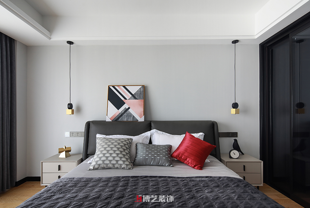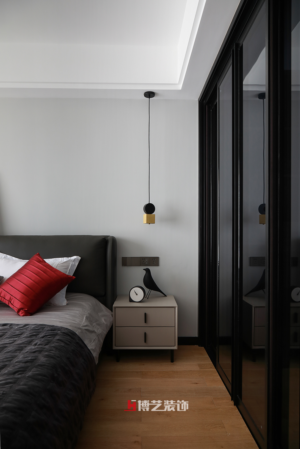 主臥延續(xù)了黑白的經(jīng)典,空間簡潔干凈,卻用一個紅色的抱枕來升華這一份浪漫。