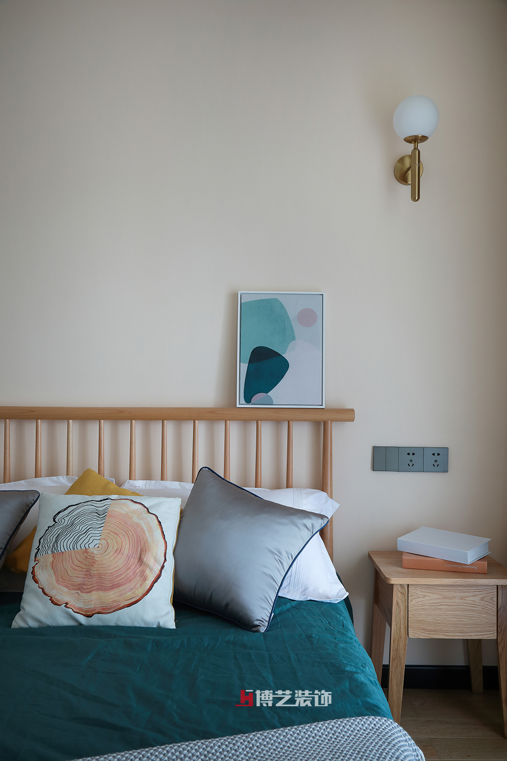 次臥用陽光的顏色搭配湖藍(lán)的四件套,細(xì)膩又溫暖,將來做兒童房又不減可發(fā)揮的空間。