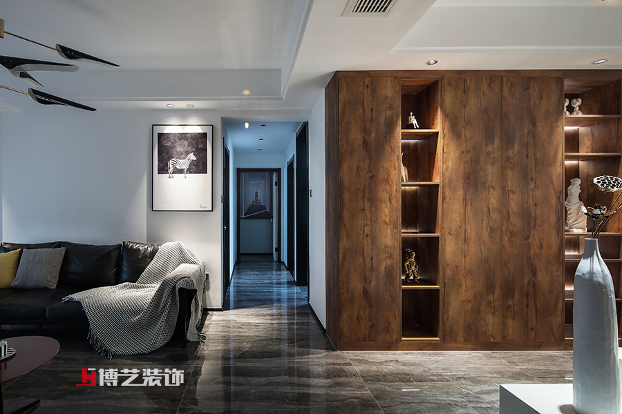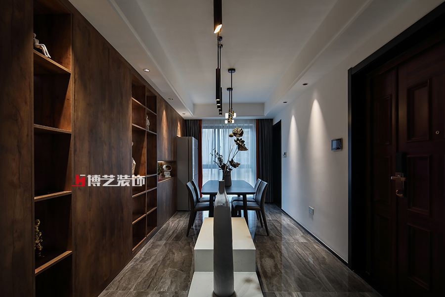 黑灰?guī)r石風(fēng)的地面磚,獷木大紋理的森林北歐系柜面,在開門的一瞬間濃烈地刺激了眼球。