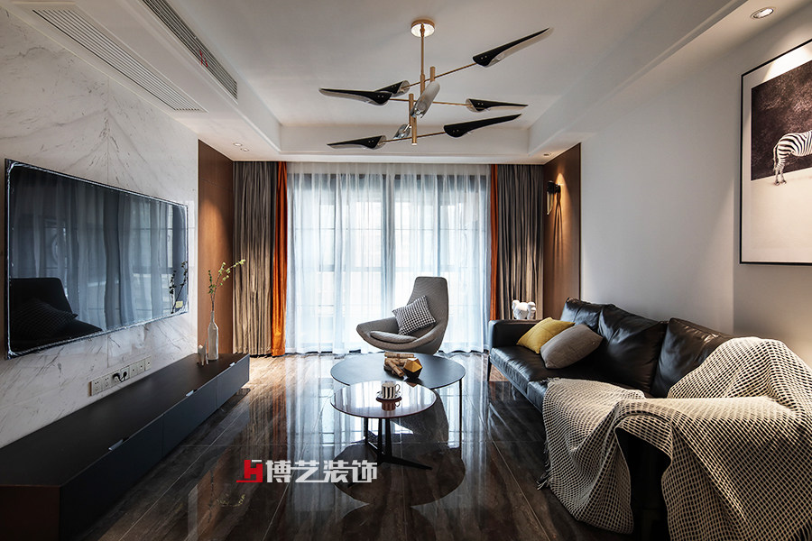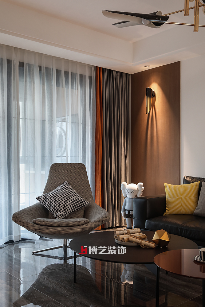 那把方正的皮質(zhì)長(zhǎng)沙發(fā)是他的選擇,是整個(gè)空間里格調(diào)的高級(jí)黑。