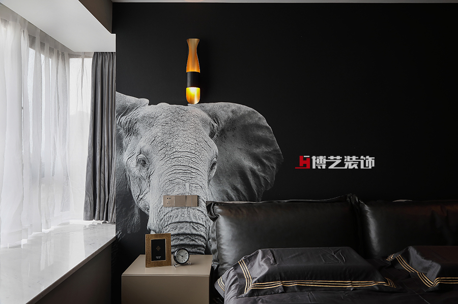 床之依靠處,復(fù)古黑的墻紙渲染,一頭隱喻愛撫的灰色大象在簾子處隱現(xiàn),它從夜的深處來(lái),愛是守護(hù),是寵愛,是安詳。