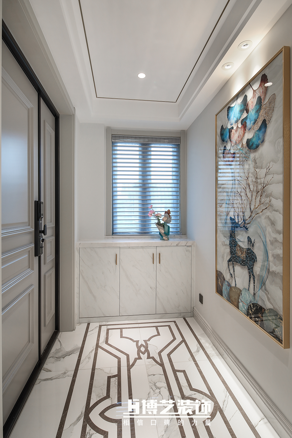 敷一入門,大理石的拼花地面承載你回家的儀式感,白色的空間搭配出簡單的高級。