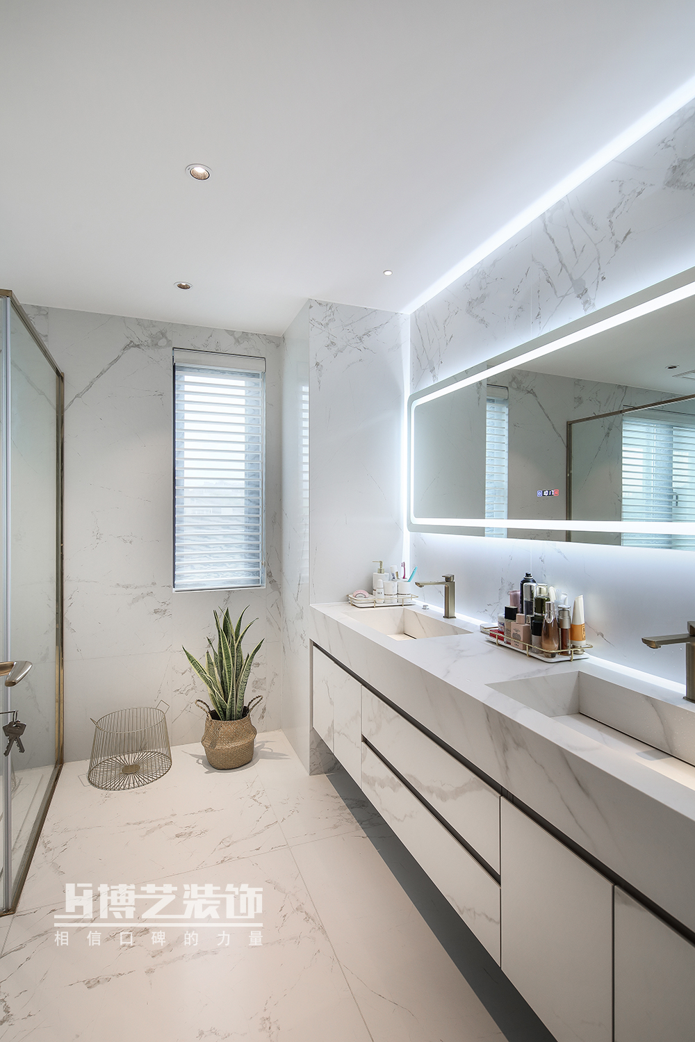 主衛(wèi)與臥室保持一樣的基調(diào),白色大理石與金屬清冽的鋪展,讓衛(wèi)浴間極具高級感。