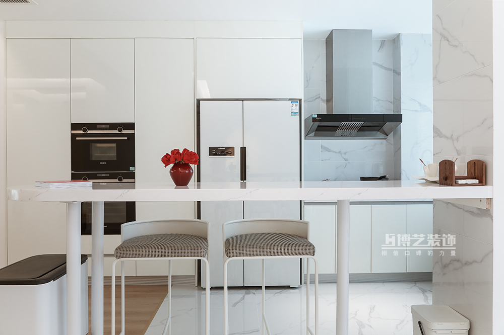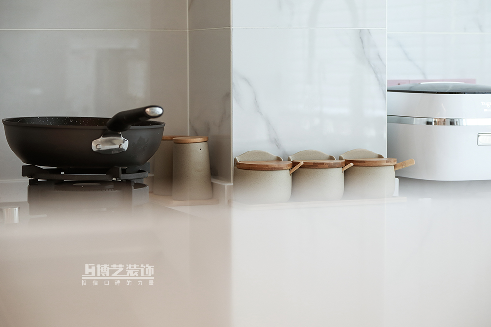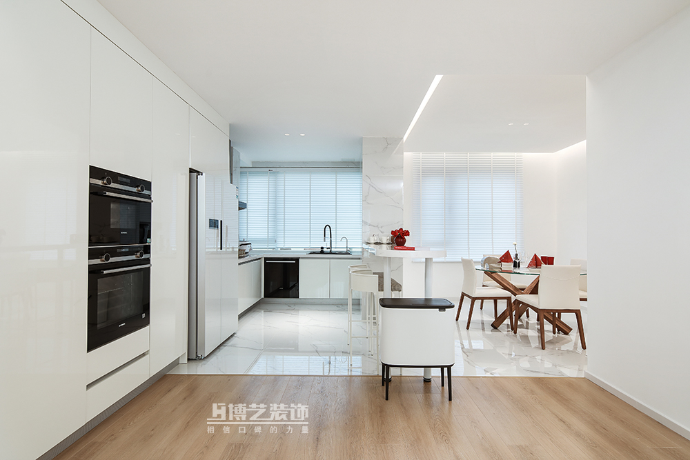 全開(kāi)放的格局,設(shè)計(jì)師依舊以白色為基底,不摻雜一絲雜色,營(yíng)造出干凈、簡(jiǎn)潔的視覺(jué)感官。柴米油鹽的煙火氣與藝術(shù)的設(shè)計(jì)感相迎,還原一片至靜、至遠(yuǎn)、至真、至雅的生活意境。