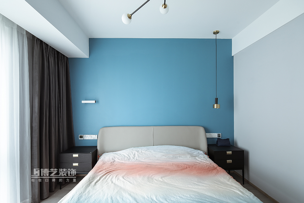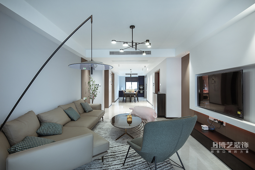 客廳受原始結(jié)構(gòu)的限制,設(shè)計師把落座的沙發(fā)放置在較寬裕的一面提升舒適感,次臥的門采用隱形門的設(shè)計,很大程度上擴大了原本電視背景墻的寬度,色彩上以白色做中色,調(diào)和莫蘭迪藍色與棕色的碰撞,豐富空間層次感。