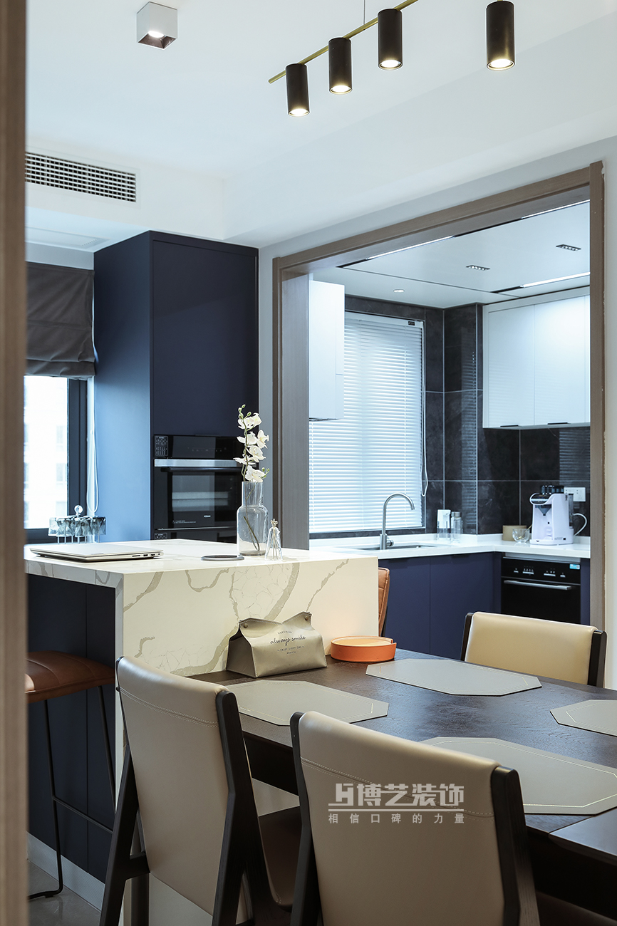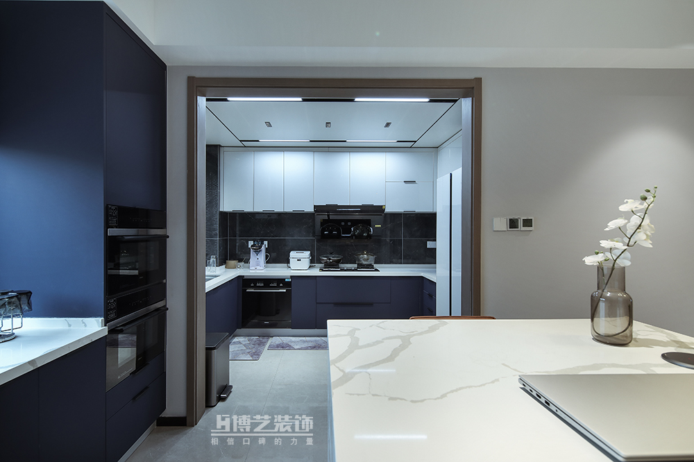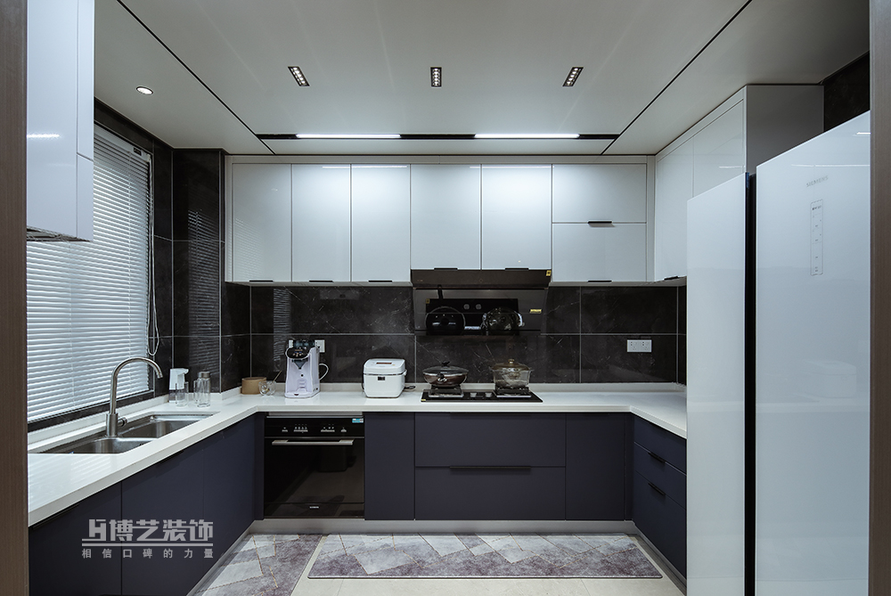 廚房改掉傳統(tǒng)集成吊頂,采用大板吊頂嵌入線性燈光,提升顏值,色彩上與西廚一致形成里外呼應(yīng)。