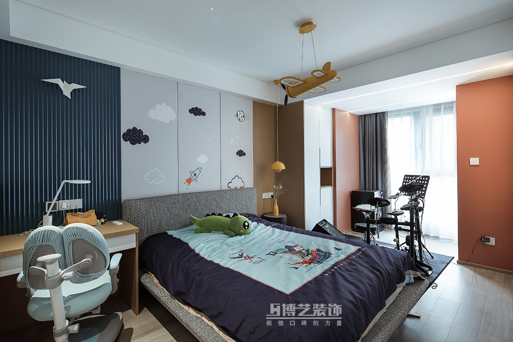 由于男孩在學(xué)習(xí)架子鼓,所以設(shè)計師把小陽臺打作為練習(xí)區(qū),用藍色、棕色、灰色三中顏色,不同材質(zhì)的造型背景表達男孩活潑好動的性格。