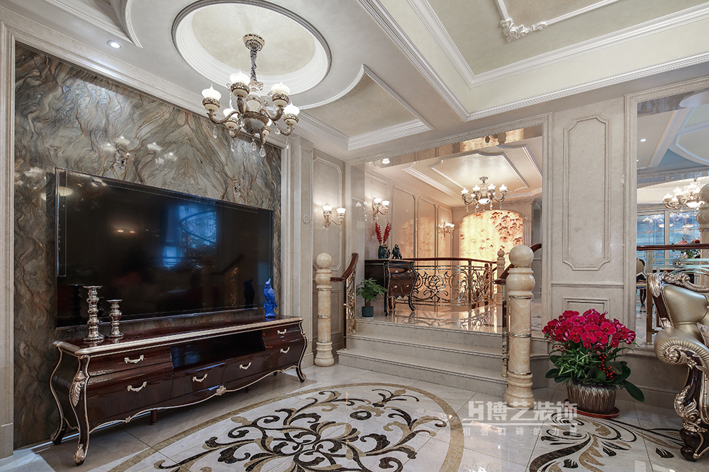 客廳以浪漫主義為主導(dǎo),在大理石與線條打造的法式框架下于細(xì)節(jié)處表現(xiàn)巴洛克的精雕細(xì)琢,以華麗的軟裝,濃烈的色彩,精美的造型烘托高貴優(yōu)雅的居家環(huán)境。