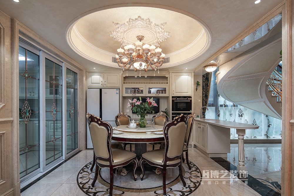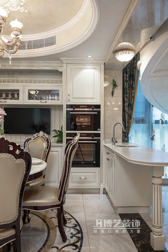 圓形的吊頂搭配經(jīng)典的法式雕花,造型古樸的水晶燈,使整個(gè)空間看起來富含韻律感且大方典雅,奶白色的櫥柜為整個(gè)空間帶來柔美的氣質(zhì),水吧臺的設(shè)計(jì)與其他空間形成互通,在視野上得到拉伸。