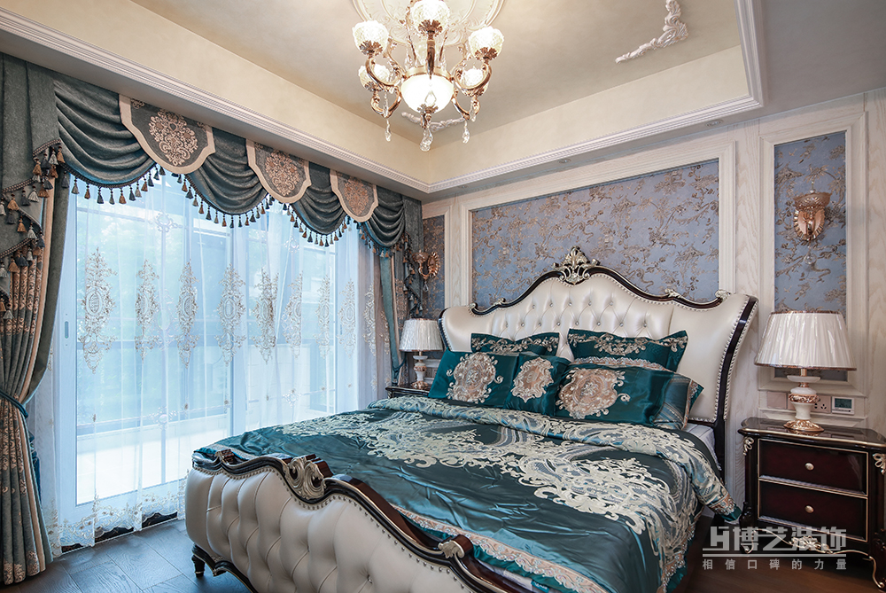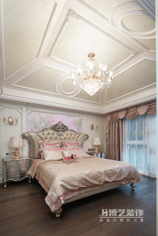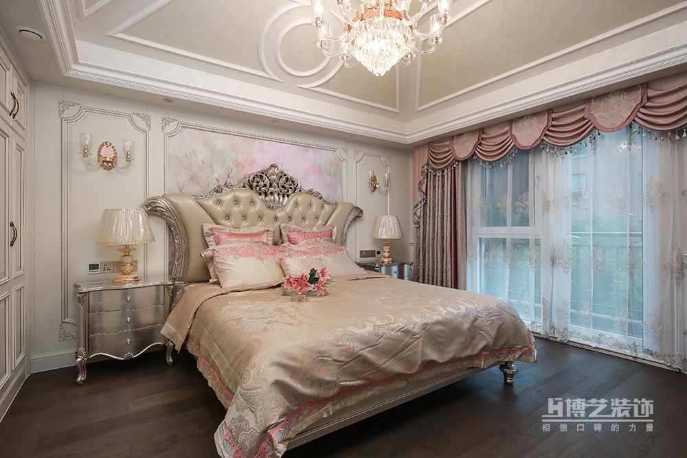 法式復(fù)古吊頂,華麗水晶燈,粉色窗簾將優(yōu)雅、浪漫的因子復(fù)刻進(jìn)這白色的空間里,雕花的法式大床讓臥室變得更加高雅,床頭泛著銀色的床頭柜更是增添了幾分華麗與時(shí)尚的氣息。
