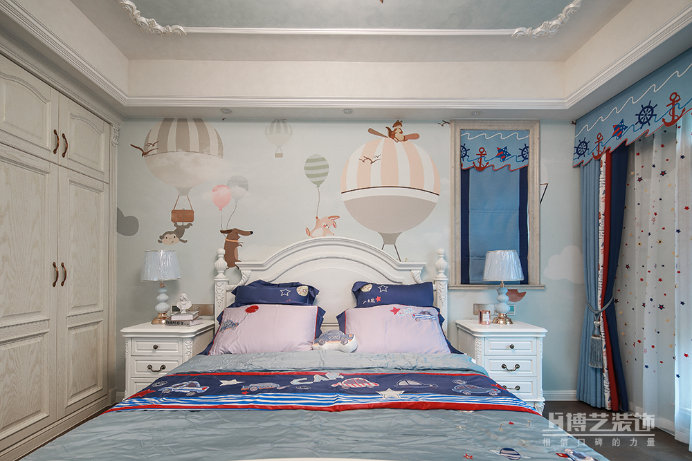 滿是童趣的房間里,小動物的墻布背景,汽車的床品,星星的窗簾,這是小小少年快樂成長的一方小天地,這是一處童真的世界。