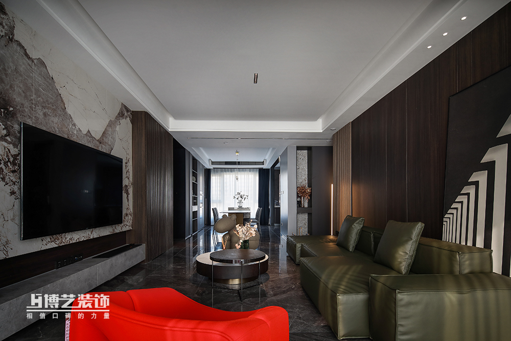 木飾面環(huán)繞的客廳空間溢出滿室的溫情,大理石的應(yīng)用很好的中和了多余的膩味,一把搶眼的紅色單椅,仿佛是空間中注入的光讓生活有了新的定義。