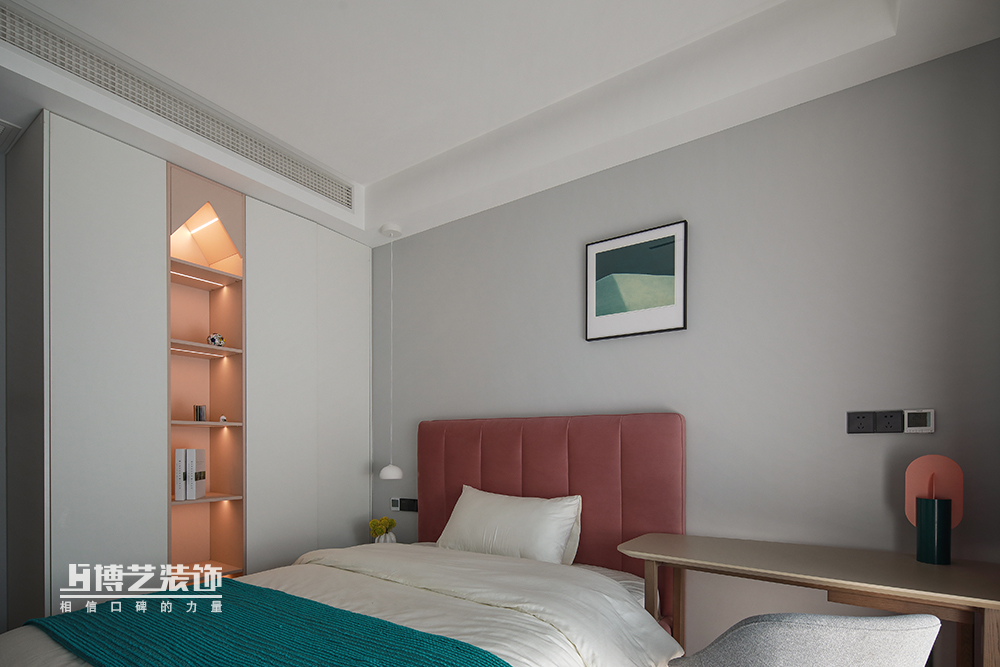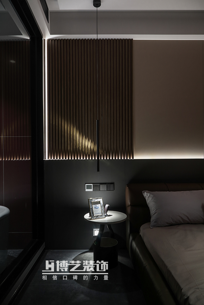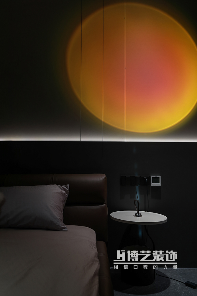 暗色調(diào)的臥室,自然地形成一個靜謐的場域,一盞日落燈暈染了溫柔的氛圍,這是為你準(zhǔn)備的“盛宴”。
