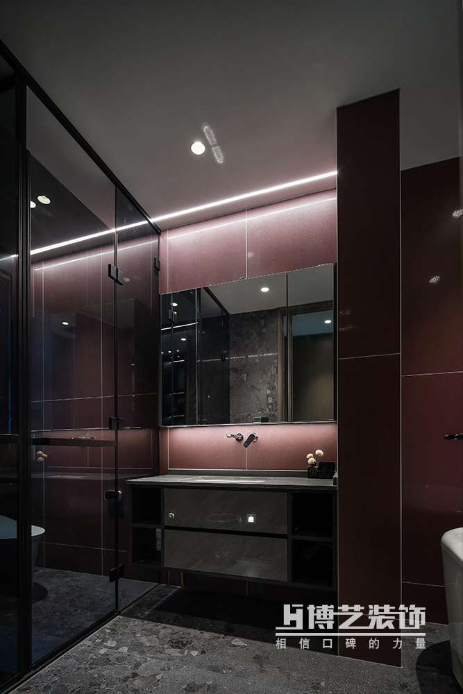 玻璃的隔斷,讓空間在視覺上得到拓展,紅與黑的低飽和綻放,讓高級感鋪面而來,在暗夜里撩撥著誰。
