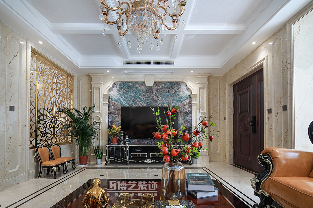進入客廳,以簡約的線條勾勒出空間感和立體感,大理石的獨特質感和紋理彰顯空間的尊貴氣息。