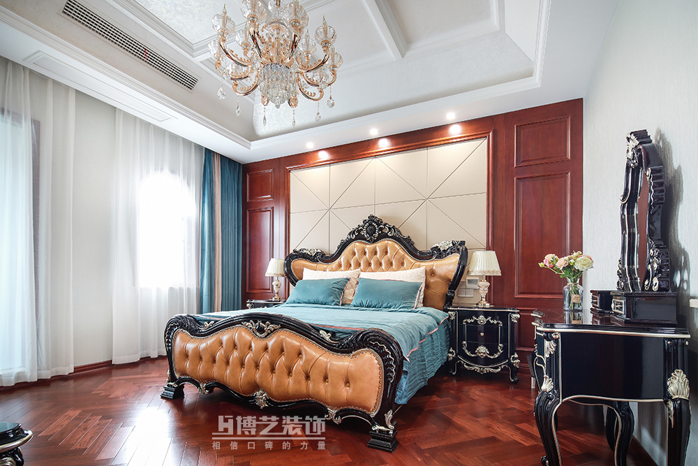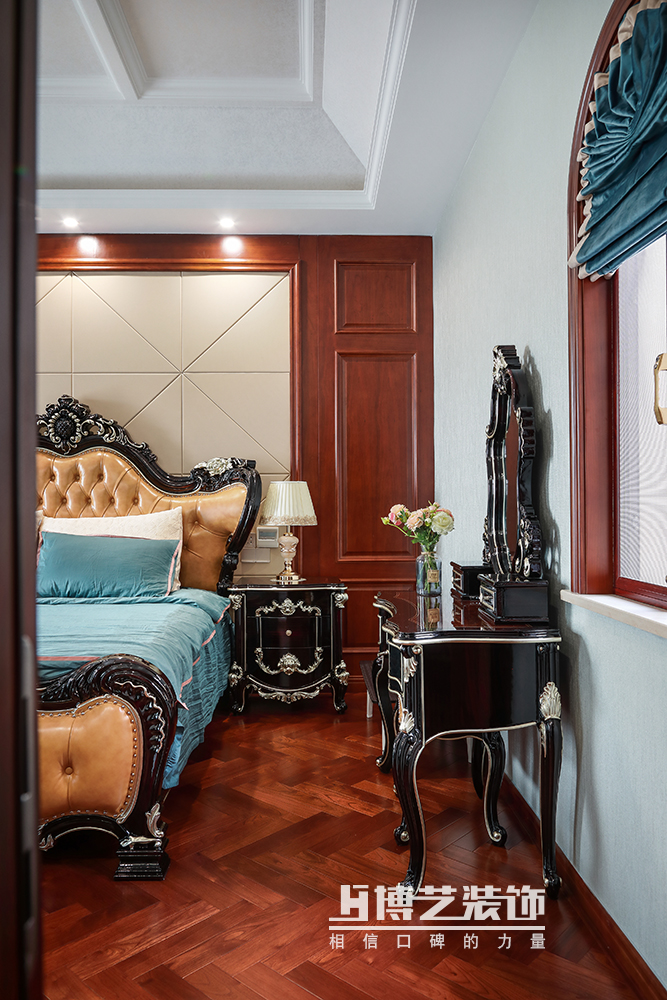 微微上挑的吊頂,提升整體舒適度。床背景是木飾面與硬包的組合大氣優(yōu)雅,集合復古的家具讓臥室空間更顯輕松溫馨。