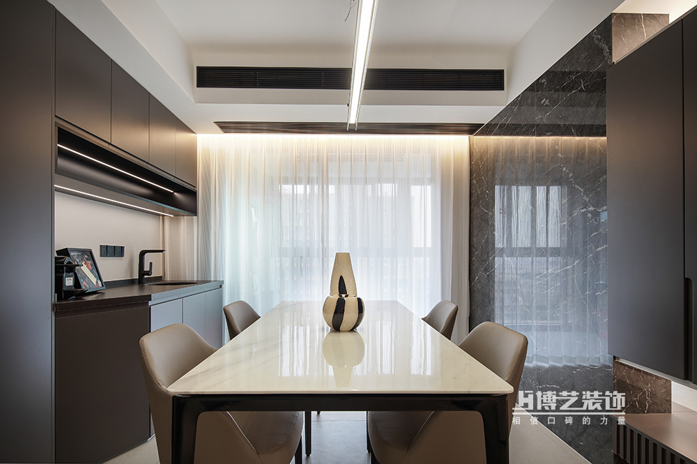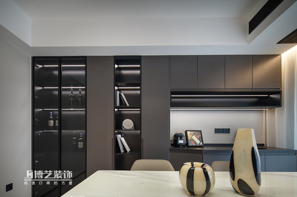 西廚緊挨著廚房,半開放的設(shè)計保證油煙不外散。小吧臺的設(shè)計兼具收納功能,同時方便日常簡餐,閑時亦可與家人朋友小資一刻,悠悠半日閑。