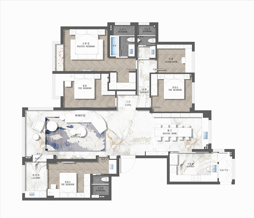 本案是為一家六口設(shè)計的居所,三代人獨立且和睦的生活需求在溫馨且有質(zhì)感的家居空間中得到一一滿足。