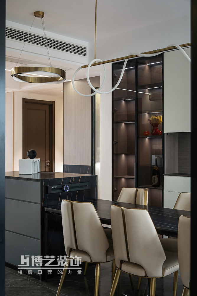 餐廳做“回”字型結(jié)構(gòu),寬敞的空間滿足六口人進(jìn)餐而不被擁擠。兩邊的餐邊柜增加了更多的收納功能,靠近門口的一側(cè)做換鞋凳,方便生活起居。