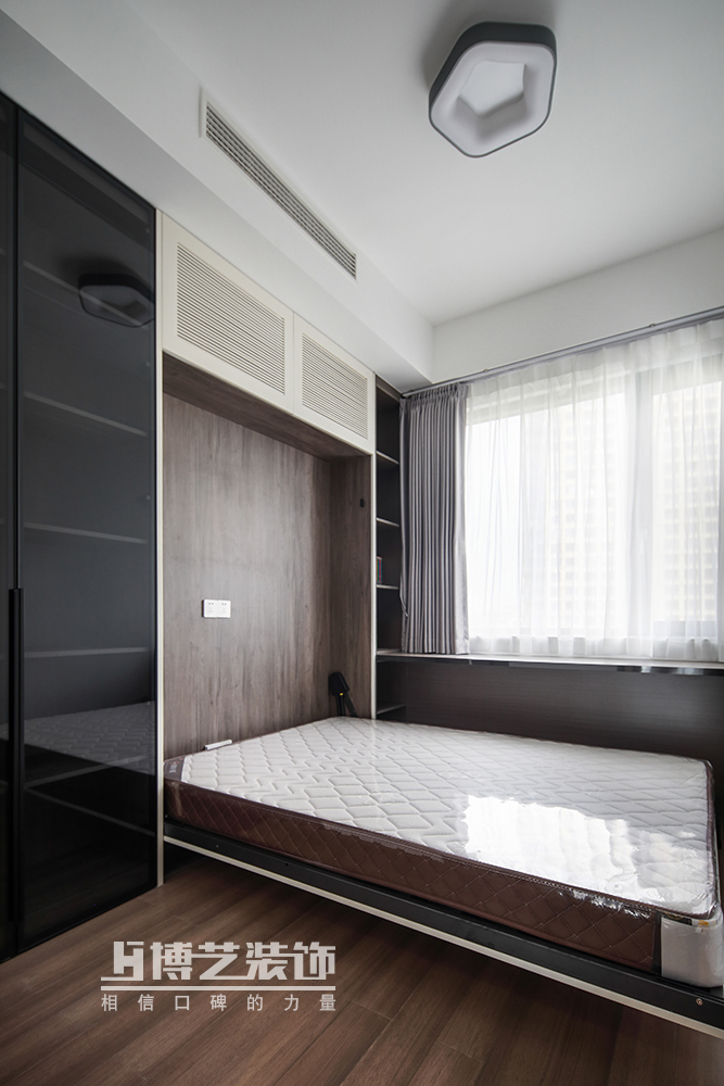 北次臥靠墻打書柜,添置一張墨菲床收起來美觀且解放空間,暫時可做學(xué)習(xí)室或瑜伽室,未來可作為另一間兒童房。