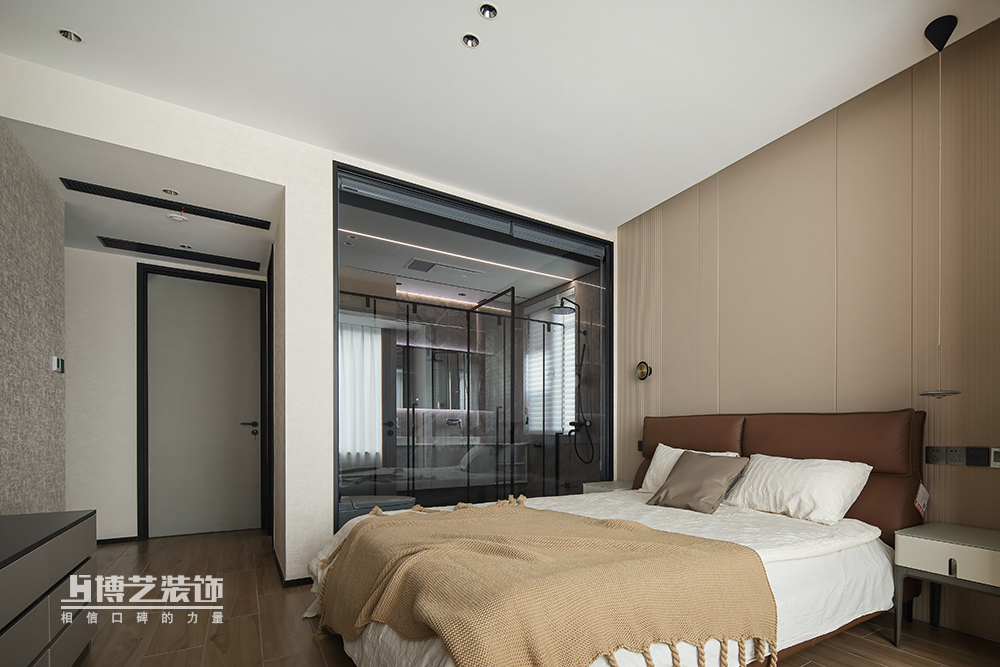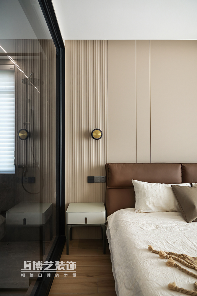 奶茶色的臥室空間,黑色沉穩(wěn)帶來(lái)滿滿的安全感,深咖色的床靠與白色床品堆疊豐富空間層次感,舒適與溫暖,柔暖的環(huán)境進(jìn)入深沉睡眠。