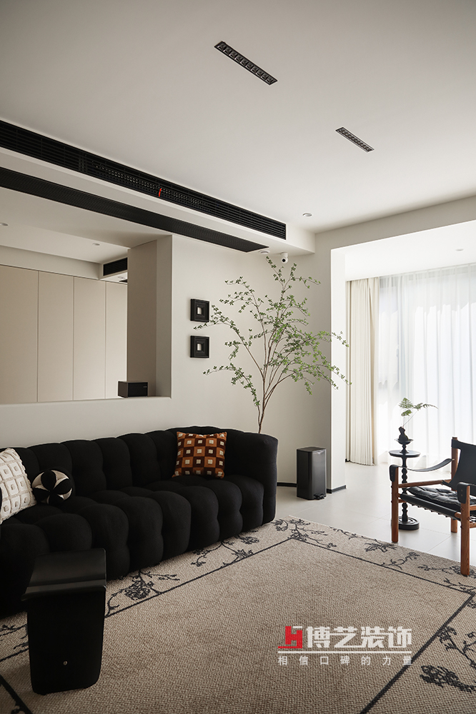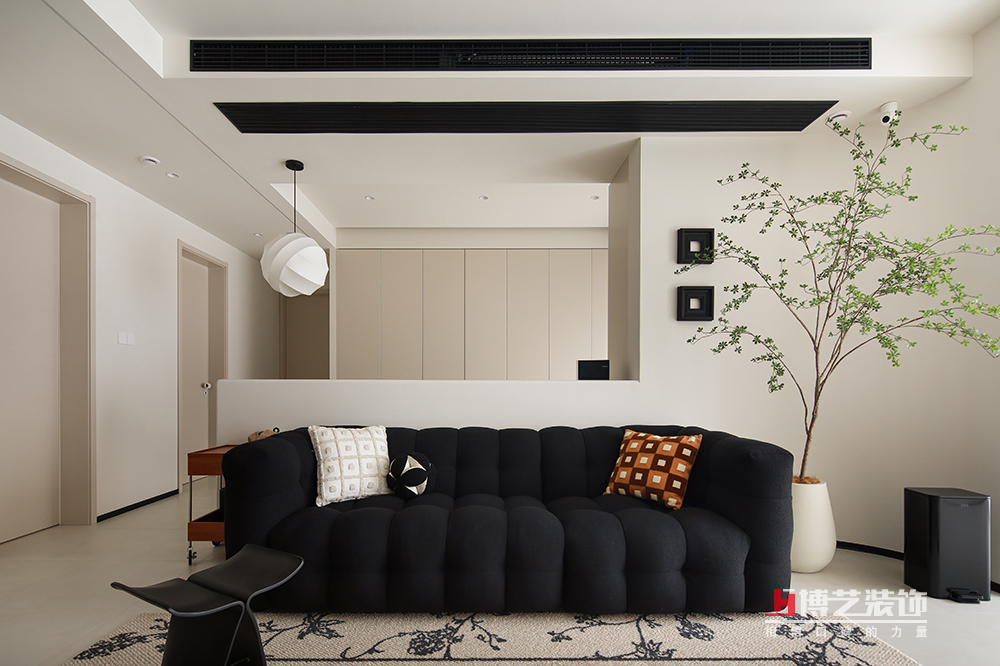 客廳奶咖色的木質(zhì)電視背景墻與黑色布藝沙發(fā)交相呼應(yīng),一深一淺,一柔一剛,呼吸間仿佛置身于厚實的土地上,抬頭仰望星空,踏實與自由并存。