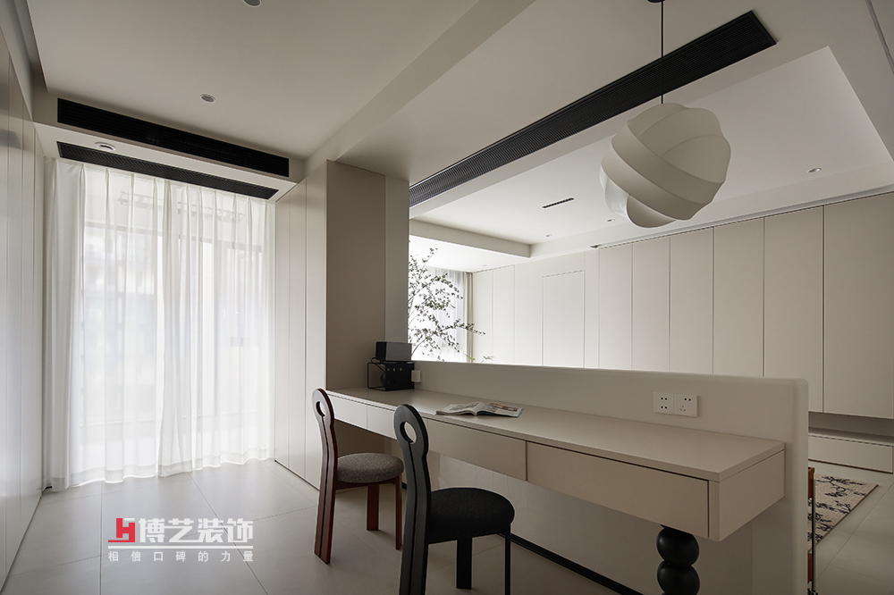 在客廳背面,與之緊緊相連的是一個開放式書房,區(qū)別于傳統(tǒng)密閉空間的書房,我們將書房進(jìn)行了空間上的外放。不論是居家辦公,還是閑時閱讀創(chuàng)作,既能有一方專屬的天地,又讓自己不閉塞于物理空間中,創(chuàng)作思緒也隨之自由揮發(fā)。桌子、柜子的半隔斷設(shè)計,不僅區(qū)分了兩個空間,還兼具家居存儲收納作用。