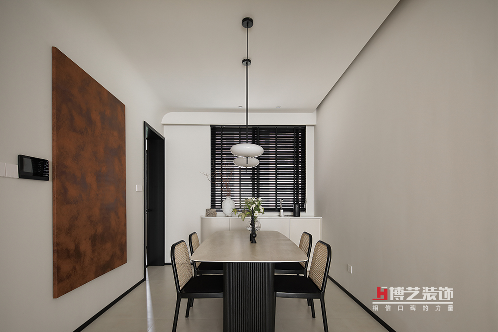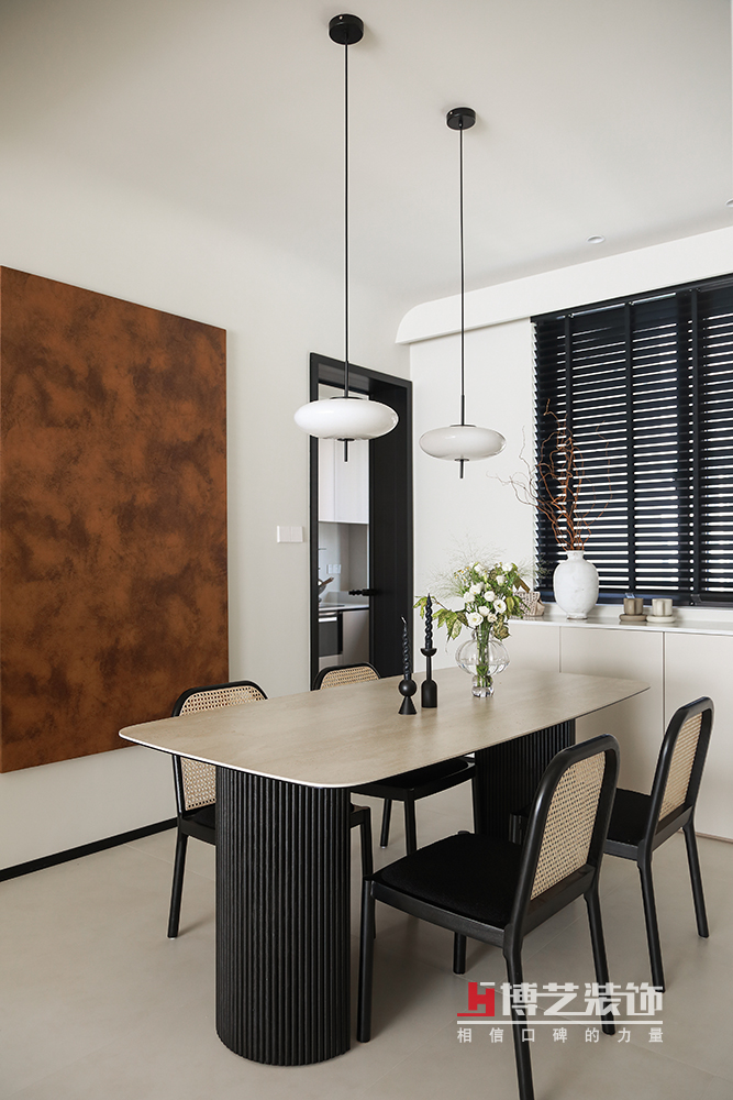兩盞圓形吊燈,一張方形餐桌,自古“天圓地方”的設(shè)計理念在餐廳得到了很好的展現(xiàn)。黃褐色的大幅裝飾畫,又給餐廳黑白空間中注入了一劑更堅定柔和的力量,讓餐廳空間的色彩不至于單調(diào)。